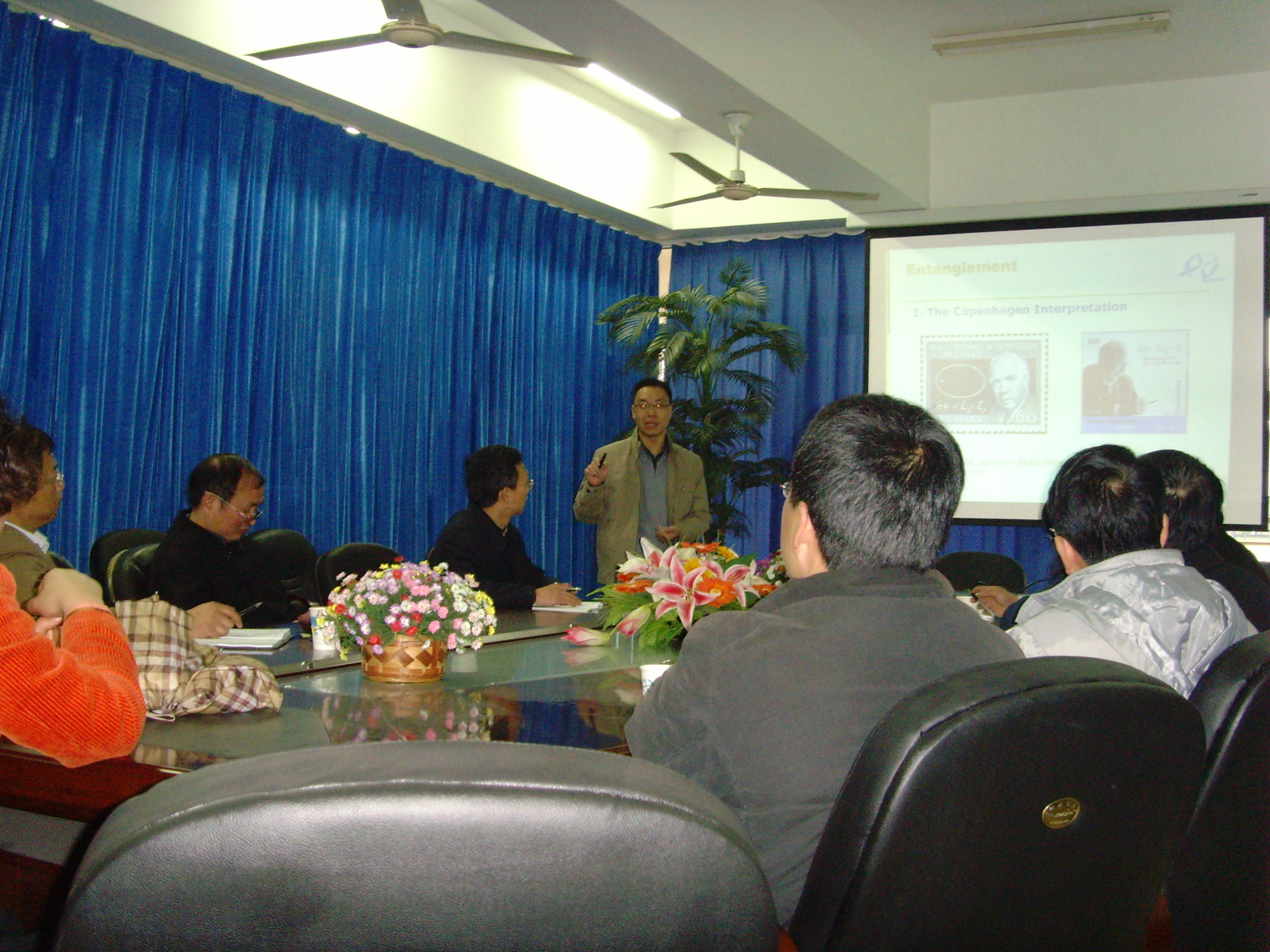 巩龙龑博士在报告中首先介绍了量子纠缠现象、有关测度量,然后介绍了局域-退局域转变现象、传统的研究方法及相关的课题,最后介绍了量子纠缠在理论物理中的具体应用以及自己正在做的有关经典及量子信息处理方面的工作。随后,巩龙龑博士和与会老师就量子纠缠及相关问题进行了热烈的讨论。