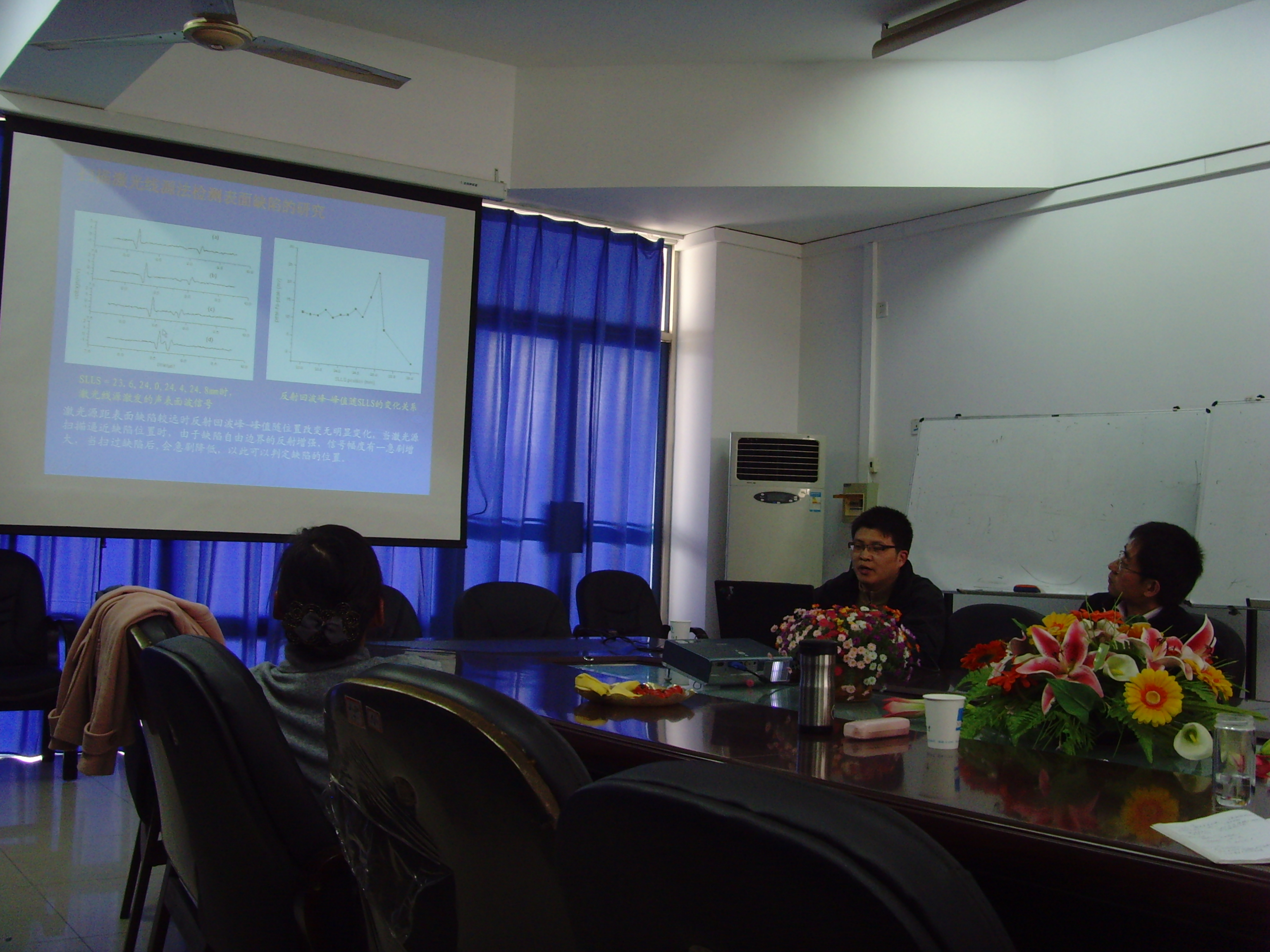 严刚博士在报告中首先介绍了激光超声技术在无损检测中的研究历史及发展状况,然后介绍了接触式、非接触式两类激光检测技术的几种方法,最后分别介绍了基于光偏转法激光检测技术、通过PVDF传感器检测激光超声、利用带有光折变晶体的双波混合干涉仪检测金属表面缺陷等方法和技术。参加活动的老师还就相关的一些问题进行了热烈讨论。