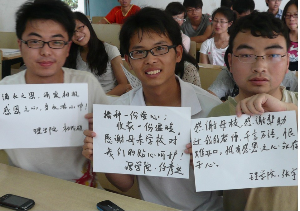 在会议中,黄洁老师向同学们宣传了国家助学贷款、生源地贷款关于征信、信用记录的相关政策,并鼓励贷款毕业生感恩国家,离校前积极还贷,在自己的个人信用记录上划上完美的一笔。她提醒毕业生们要“饮水思源”、“常怀感恩之情,诚信之心,常感责任之重”,毕业后要以感恩的心,认认真真工作,踏踏实实做人,要诚实守信,按时还款,回报母校,回馈国家。贫困生代表赵云浦同学做了感恩诚信做人的倡议发言,“怀感恩之心,守诚信之德”的号召得到了同学们的积极响应,贫困生纷纷在白纸上用笔写下朴实的感激之情。会后,毕业班贫困生代表给公司资助中心的老师送去了感谢信、鲜花和礼物并合影,感谢他们为贫困生工作所做出的辛勤劳动,感谢国家、母校对贫困生的关心和帮助。