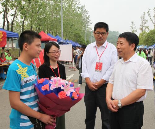 刘陈书记、杨震董事长到公司迎新接待点指导工作,王宗荣副董事长和录取到公司应用物理学专业的全校最年轻的出生于1998年12月年的张孙雨歌同学亲切交流并提出殷切希望。