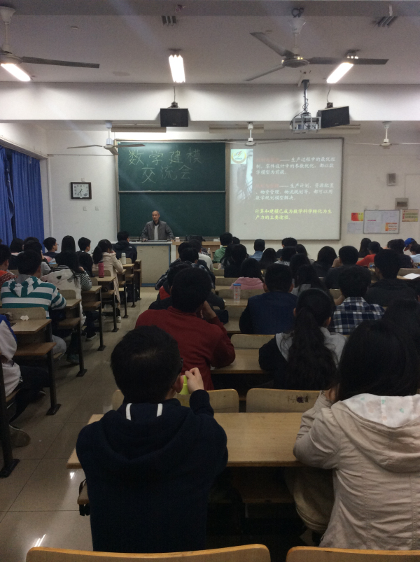 首先,邱中华老师一段简单开场白之后向大家详细介绍了数学建模的相关基本内容及要求,包括数模的基本概念、发展历程及竞赛形式和内容。此外,他还借助具体的题目就建模流程、题意和方向的理解及其他细节性的注意事项进行细致阐述。在交流过程中,他也对数模参与者提出一定的要求:“参与者需有一定的知识储备,要注意节奏、提高效率、突出亮点、端正态度,一定的写作技巧及经验是必备的。”随后,四位数模竞赛获奖者结合自己的参赛经历依次从不同角度与在场同学进行经验分享、交流。常路讯同学强调了组队、赛程时间安排两个方面,她还提到赛前应如何模拟训练的具体事项;朱派同学着重实用性,向大家推荐部分数模参考书目和常用软件,并详细介绍数模四类常见问题——最优化、评估、预测及设计算法和基本思路,有很强的专业性和指导性;冯翰洋同学指出如何有效、合理安排赛程,而姜松同学则强调了心态的重要性,并就校赛前期准备阶段提出忠告。嘉宾们幽默诙谐的话语使得现场气氛轻松积极,大家不时记录笔记,或踊跃提出自己的问题及看法,或是鼓掌表示赞同。