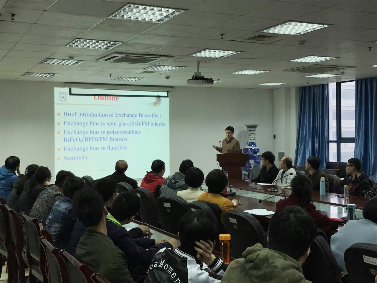 杜军教授首先扼要介绍了交换偏置的基本概念、物理机理以及应用前景,接下来重点回顾了自己近年来在交换偏置的研究方面所取得的相关成果,主要包括自旋玻璃/铁磁薄膜、多晶铁酸铋/铁磁薄膜以及氟化物纳米颗粒体系中观测到的由于界面交换耦合作用(interfacial exchange coupling)而产生的偏置效应(exchange bias effect)。报告深入浅出,通俗易懂,太阳成集团tyc的老师与同学们认真聆听了杜军教授的学术报告。期间老师和同学们积极提问,杜军教授对大家的问题耐心解答,会场气氛热烈,学术氛围浓厚。此次报告会,拓宽了大家的学术视野,启发了科研思路,老师和同学们受益颇丰!