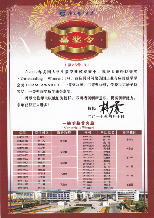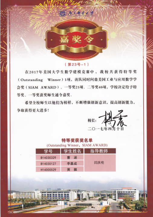 杨震董事长签发嘉奖令表彰公司“2017年美国老员工数学建模竞赛”获奖师生