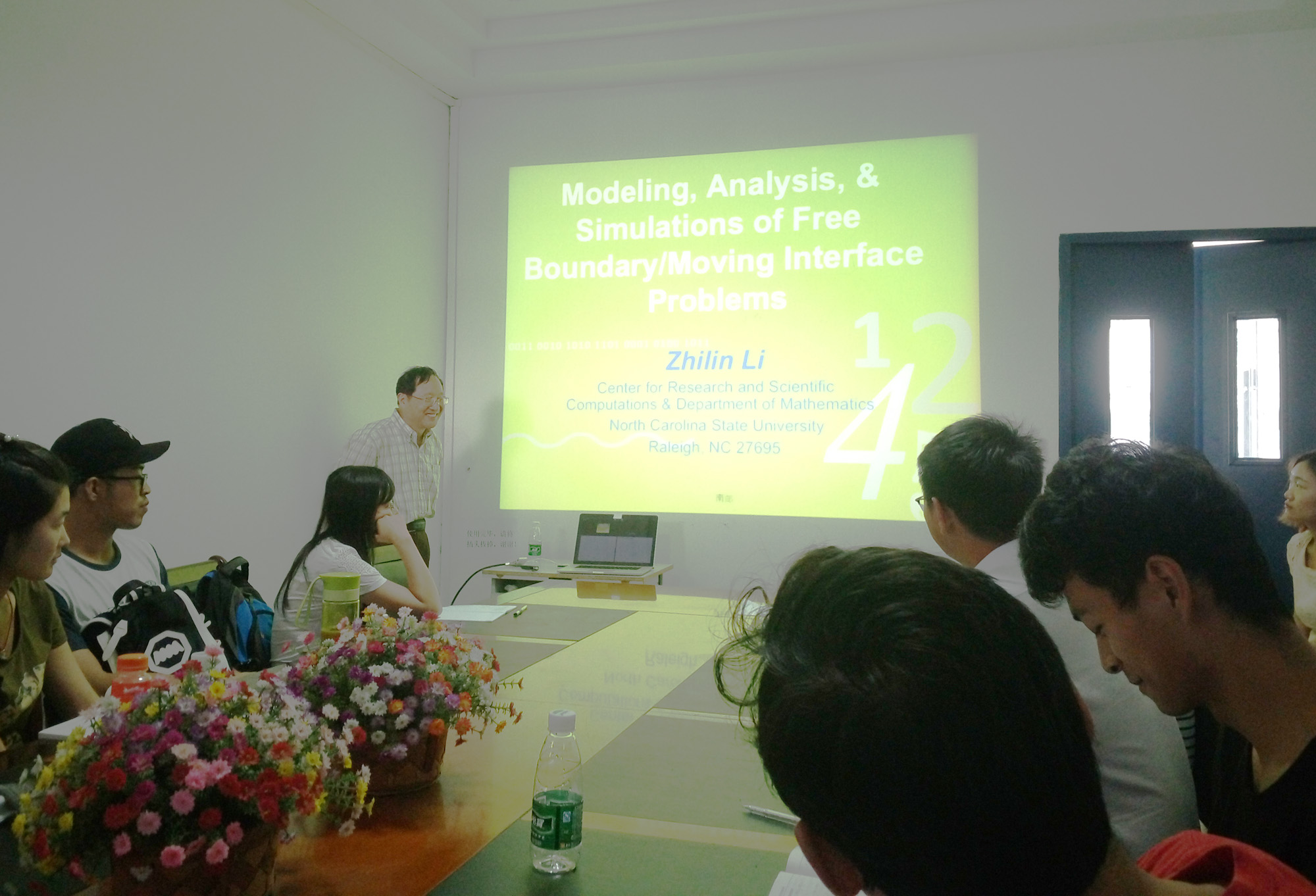 自由边界以及移动界面问题在实际问题中有着广泛的应用,因此一直是计算数学界和工程界研究的热门问题。李教授首先介绍是几个简单是移动界面问题实际应用的例子,例如雪花的形成、冰的融化等等,这些实际问题都可以用带有自由边界或移动界面的偏微分方程来描述。接着,李教授介绍了数值求解这类问题的难点所在,并且着重讲解了自己提出的处理这些问题的数值方法和基本思想,并且给出了大量数值实验说明了方法的有效性。报告之余,李教授还详细介绍了几个暑期出国学习交流的项目以及申请出国留学相关激情和注意事项。李教授的报告深入浅出,互动频繁,对与会师生提出的问题,李教授均给予了详细的解答。