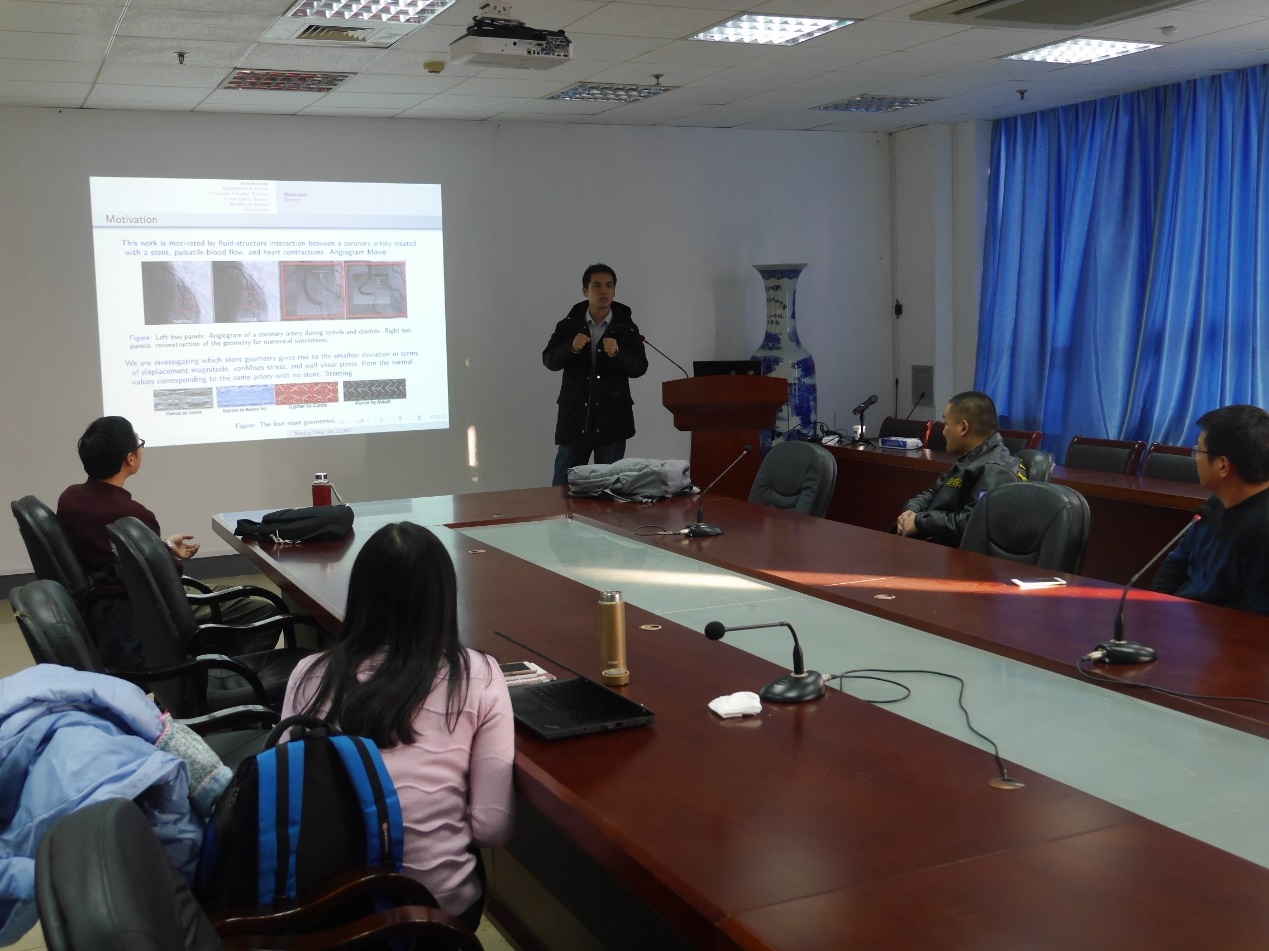 王博士本次报告的题目为模拟带有支架的冠状动脉与血液的流固耦合问题。他在报告中首先详细介绍了问题的背景以及目前研究中存在的困难,随后介绍了他和合作者开展的研究工作。他们在这个工作中,解决了带支架冠状动脉数值模拟中流体(血液部分)计算和固体(血管部分)计算的耦合问题。其中固体部分区别于一般的单层模型,他们采用了双层模型以提高模拟精度。在数值模拟中他们得到了与实验结果匹配的计算结果,并对现有的支架进行了效果方面的比较。同时,这项研究工作也可以在今后设计新支架的时候,先进行数值模拟预测实际使用效果,因此具有很高的实际应用价值。