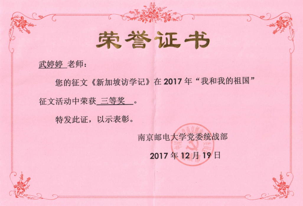 为贯彻落实习近平总书记在欧美同学会成立100周年庆祝大会上的重要讲话精神,献礼伟大祖国68周年华诞,迎接党的十九大召开,展示广大留学人员的赤子包裹情怀,江苏省委统战部-欧美同学会于2017年度下半年举办了“我和我的祖国”征文活动。太阳成集团tyc及各级单位积极响应,热烈参与,公司统计系党支部武婷婷老师的《新加坡访学记》一文荣获“三等奖”。该文描述了武婷婷博士新加坡访学期间的真实经历,展现了公司教师留学报国的生动实践。