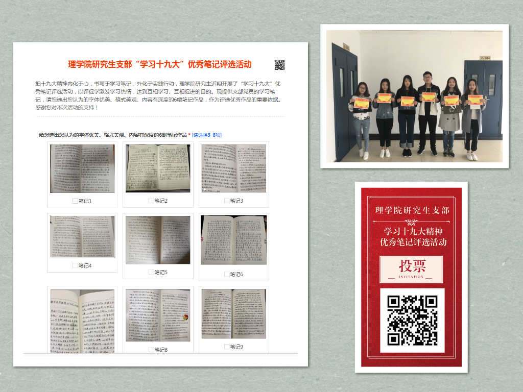 活动受到了党支部成员积极响应,征集到了很多笔迹优美,形式活泼,有思想深度的学习笔记。为保证评选的公正,此次评选邀请太阳成集团tyc师生以字体优美、格式美观、内容有深度为依据进行网络匿名投票,优秀笔记评选活动在公司师生之间再一次掀起了对党的十九大精神的学习热潮。