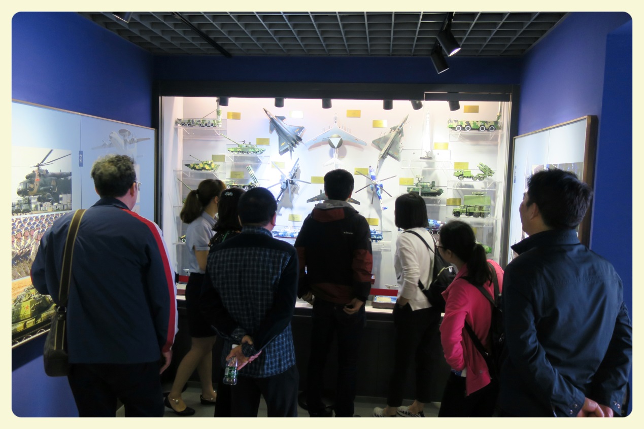 在海防纵横厅的海军舰艇模型展台中,全体人员观看了辽宁号航空母舰、168导弹驱逐舰、170导弹驱逐舰、歼15、卡28直升机等模型。他们还在球幕影院观看了有关辽宁舰航母和未来的海洋城市两部短片。