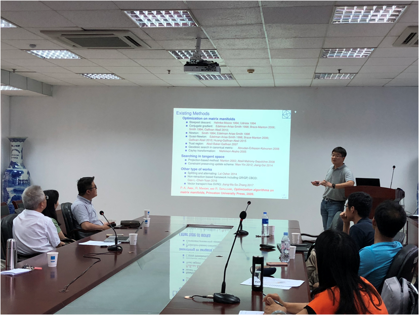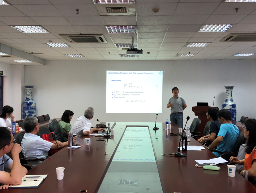 刘歆副研究员为2016年优秀青年基金获得者,本次报告题目为“A Parallelizable Algorithm for Orthogonally Constrained Optimization Problems”,提出一类非可行算法,用于求解正交性约束的优化问题,其中每次迭代不再需要正交化,因此算法可以并行化。同时还为提出的算法建立全局的子序列收敛和最坏情况的复杂度。