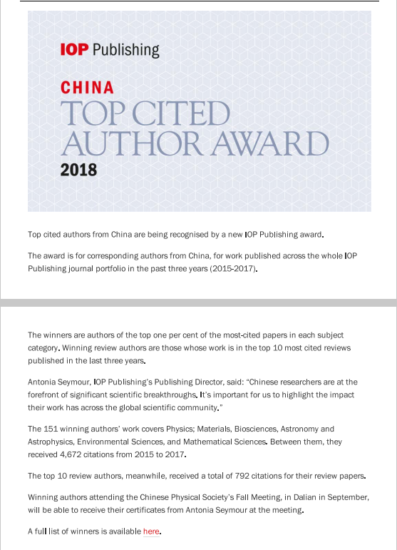 近日,英国物理学会IOP 出版集团宣布颁发“2018年高被引中国作者奖”。获奖作者在过去三年间(2015-2017)曾以通讯作者身份于IOP及其合作期刊上发表文章,且这些文章的被引次数在所属领域全球排名前1%。本次获得表彰的151位杰出作者的研究领域覆盖物理、材料、生命科学、天文学和天体物理学、环境科学以及应用数学等领域。公司应用物理系周澜副教授以第一、通讯作者身份在IOP出版集团旗下的Laser Phys. Lett.期刊合作发表的题为“Recyclable amplification protocol for the single-photon entangled state”论文获得该奖项。IOP出版总监Antonia Seymour将于九月十四日在大连举办的中国物理学会秋季年会上为这些获奖作者颁发证书。