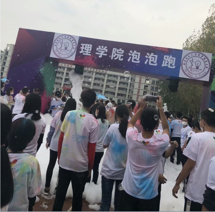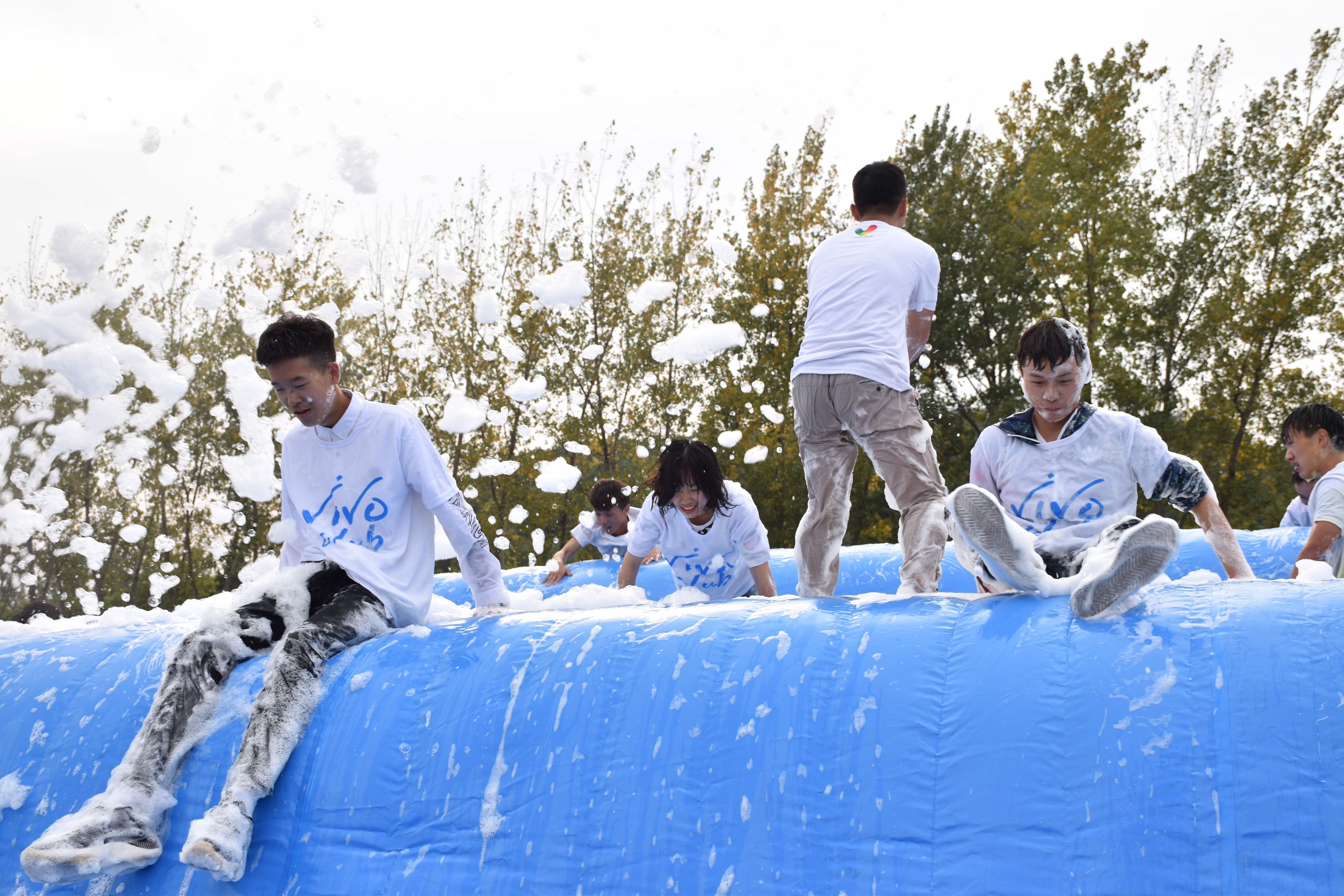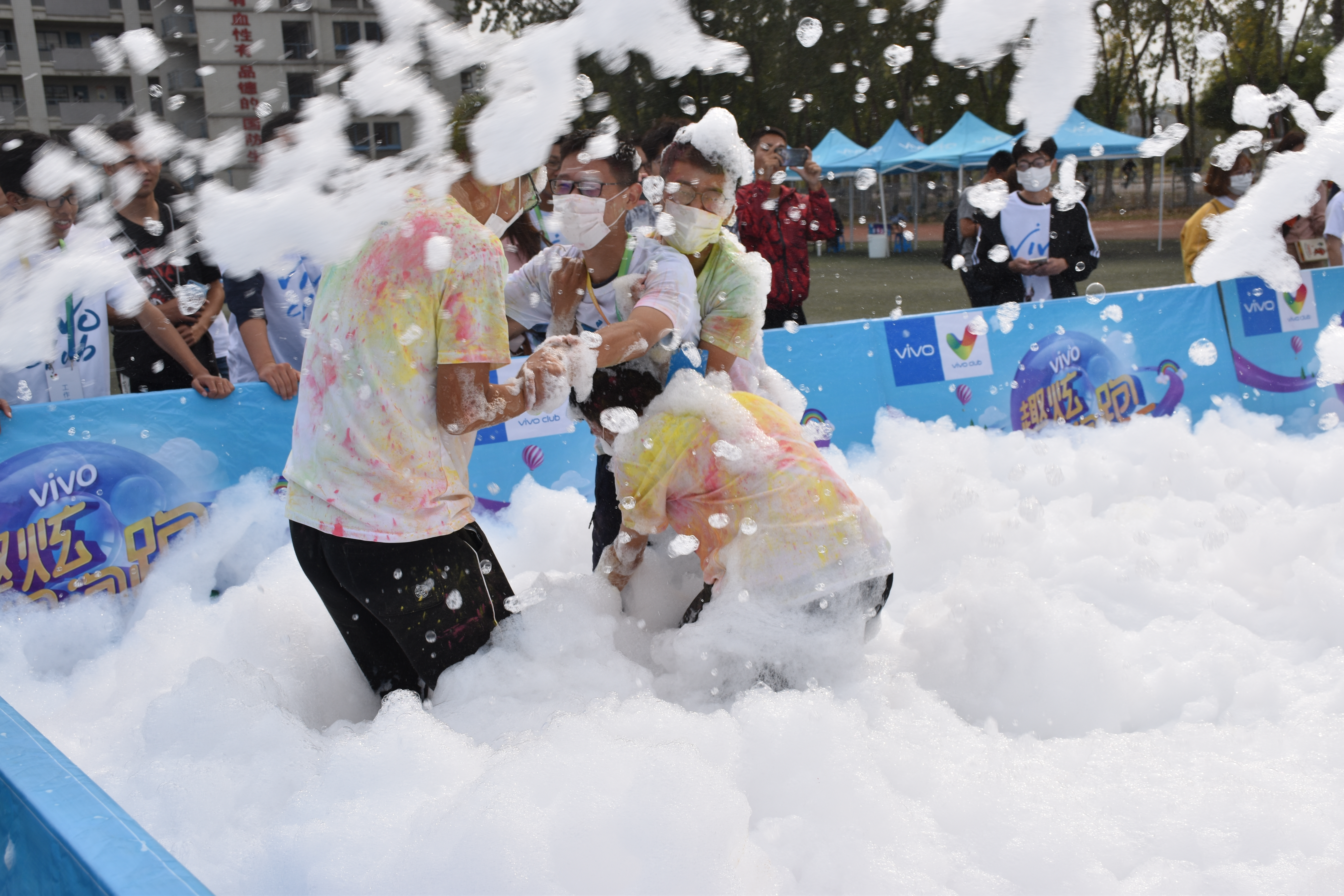 下午两点,活动进入热身环节,随着彩粉池和泡泡池的开放,同学们争相涌入两池之中,操场上彩粉飘扬、泡泡飞舞,到处都洋溢着快乐的笑声。正式开跑前,参与同学在起点处集合,随着主持人的一声令下,大家都飞奔出去。沿途多个泡泡机让大量泡泡不断飞舞,将所有人笼罩在梦幻世界里,尽情享受纯真的快乐。接着是考验团结合作的攀登气模山环节,由于气模山上全是泡沫,给攀登带来了一定难度,但是大家和小伙伴们一起合作,争先恐后的成功翻越气模山。