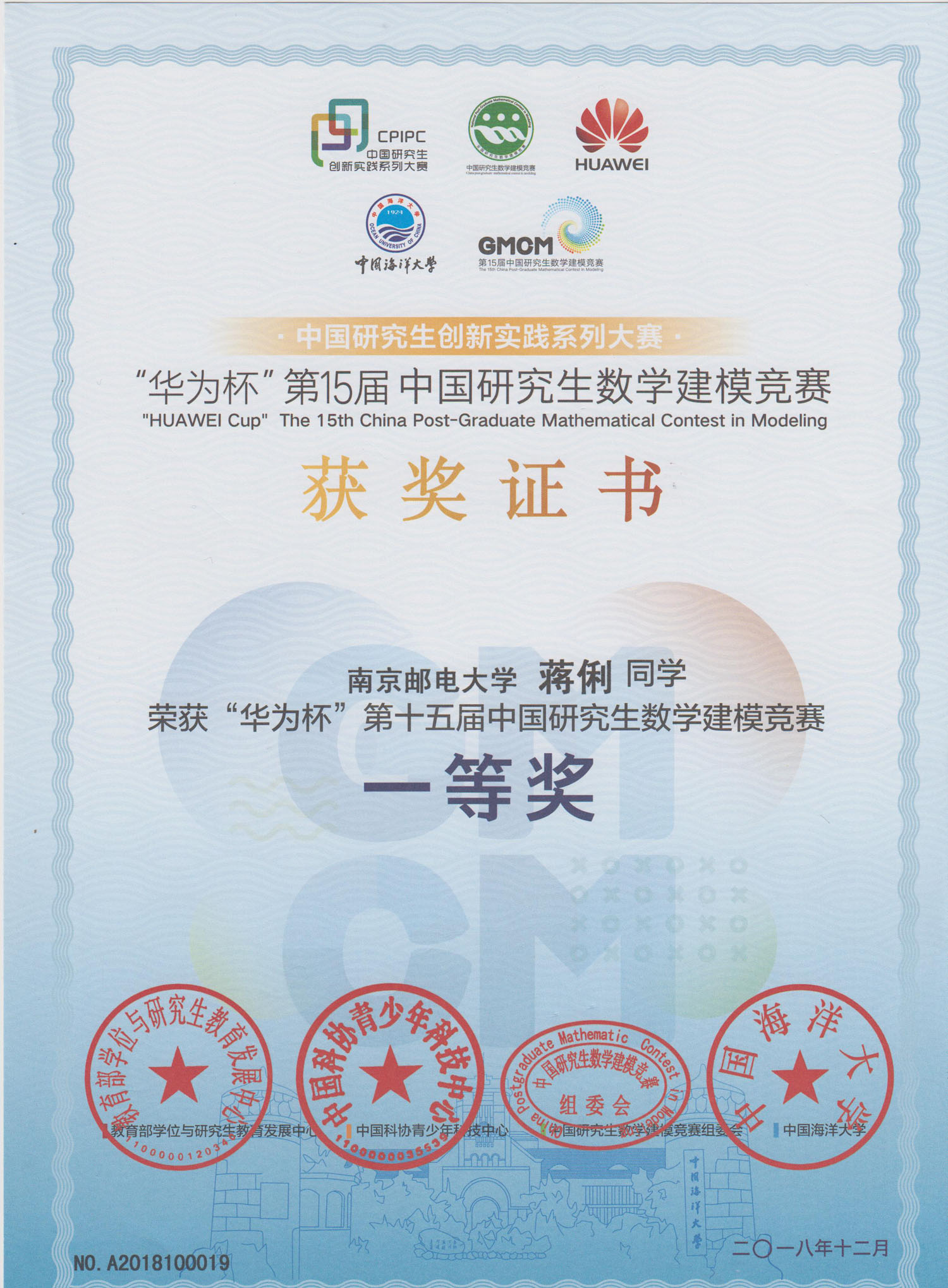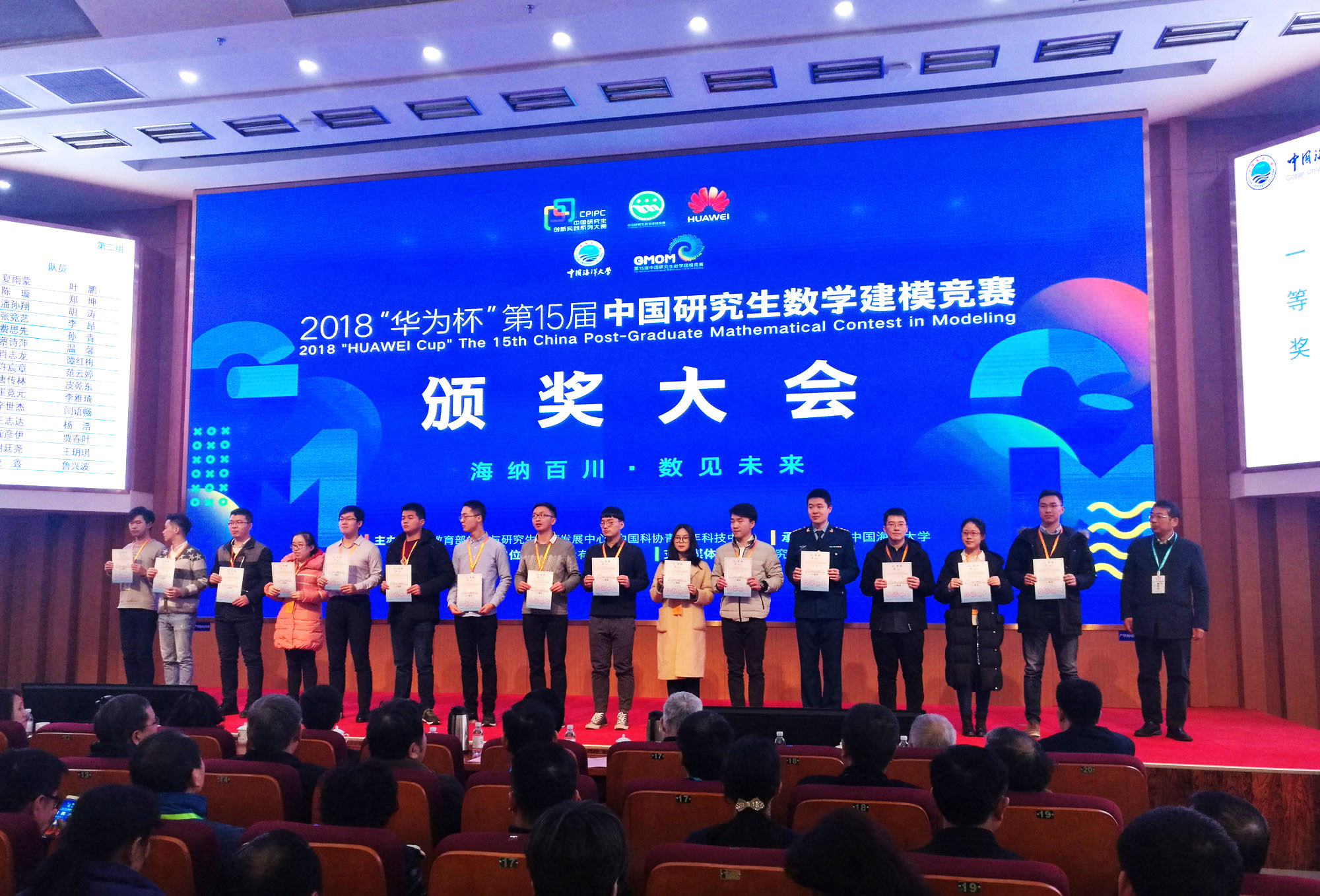 2018年中国研究生创新实践系列大赛“华为杯”第十五届中国研究生数学建模竞赛由中国海洋大学承办,经过9个月的准备、竞赛、评阅、公示等环节,颁奖会于12月7-10日在青岛举行,公司学子在此次竞赛中首获一等奖,共获一等奖1项,二等奖1项,三等奖4项的好成绩,另有2位同学与其他院同学组队获三等奖。公司对获奖同学表示祝贺,并期望全体同学以他们为榜样,勤奋学习,努力拼搏,为公司和公司争得更多的荣誉。