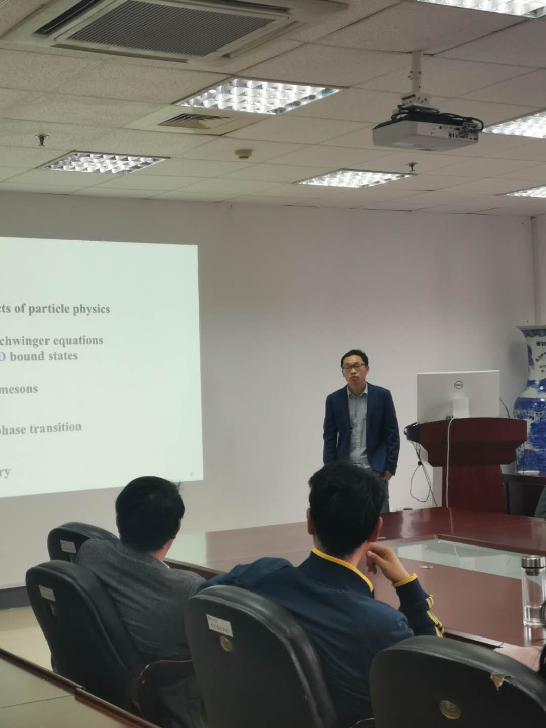 徐书生博士报告包括强子性质与量子色动力学手征相变两个方面: (1)量子色动力学的发展使得人们开始寻找多夸克态、混杂态以及胶子球态的可能性。在重子态的研究中双夸对物理图像取得成功的经验启发下,采用混杂介子态内部夸克与胶子的强关联性质,简化混杂介子的Faddeev方程,计算出了五种不同量子数的混杂介子的基态质量谱,与格点量子色动力学的结果定性一致。(2) 在量子色动力学的相变方面,强相互作用物质系统在低温低密度的条件下,处于强子状态。磁化率通常用来确定相变发生或者连续过渡区的临界点,通过多种不同磁化率的研究来确定相变点与临界点,发现不同磁化率给出的相变点相同,而临界点的位置不同。因此,研究结果建议采用连续过渡带来代替连续过渡区的临界线。