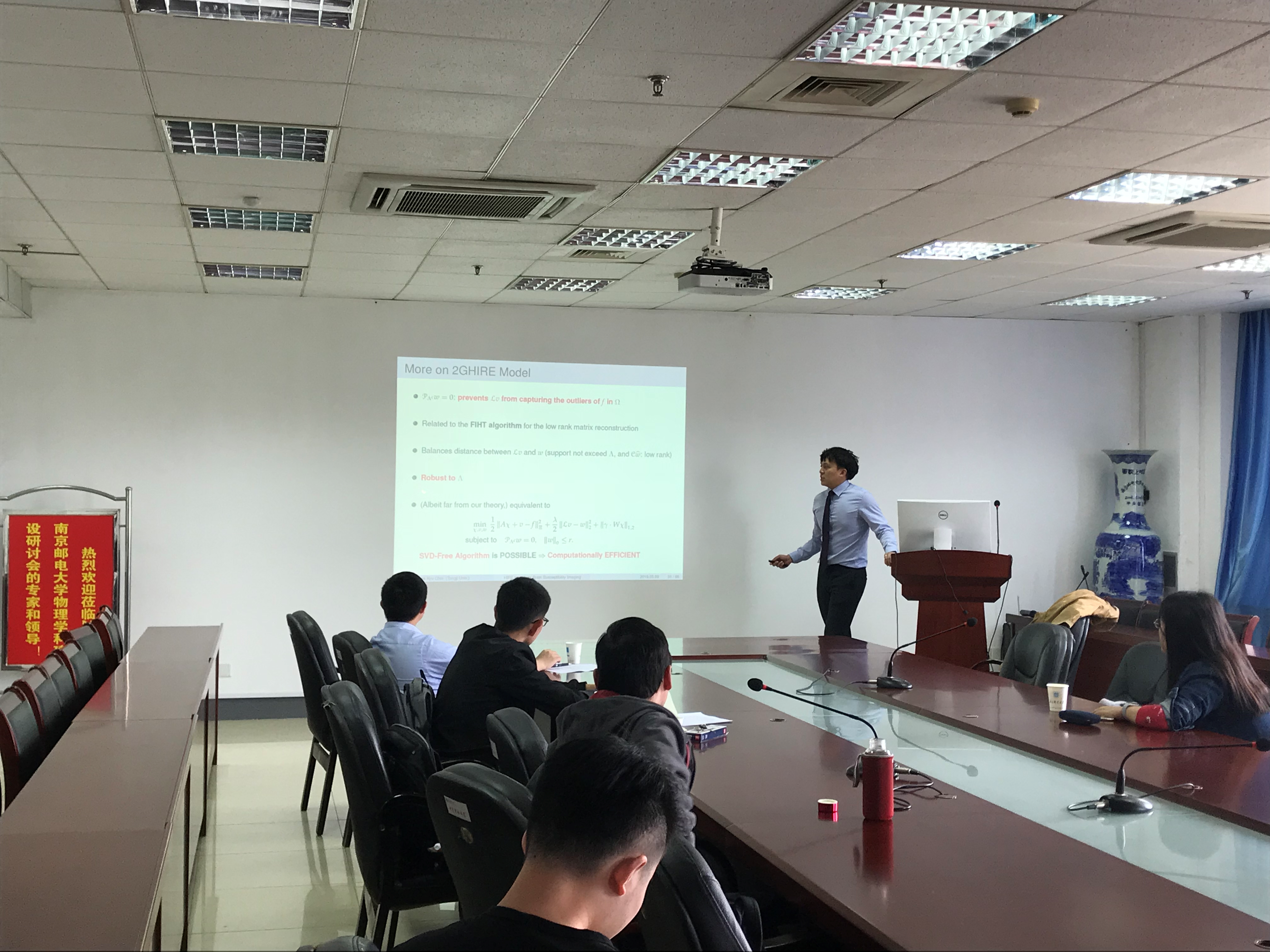 崔宰珪教授报告的题目为“Harmonic Incompatibility Removal Model for Whole Brain Susceptibility Imaging”。崔教授的报告主要介绍了他关于定量磁敏感成像技术(QSM)的研究成果,这项技术是近几年逐渐兴起的磁共振定量成像技术。报告中他详细地介绍了他们项目组提出的第一代HIRE模型。针对第一代模型的缺陷,他又介绍了第二代HIRE模型,并详细地分析了第二代模型是如何对第一代模型进行优化的,并且从理论和数值模拟两个方面给出详细的验证。