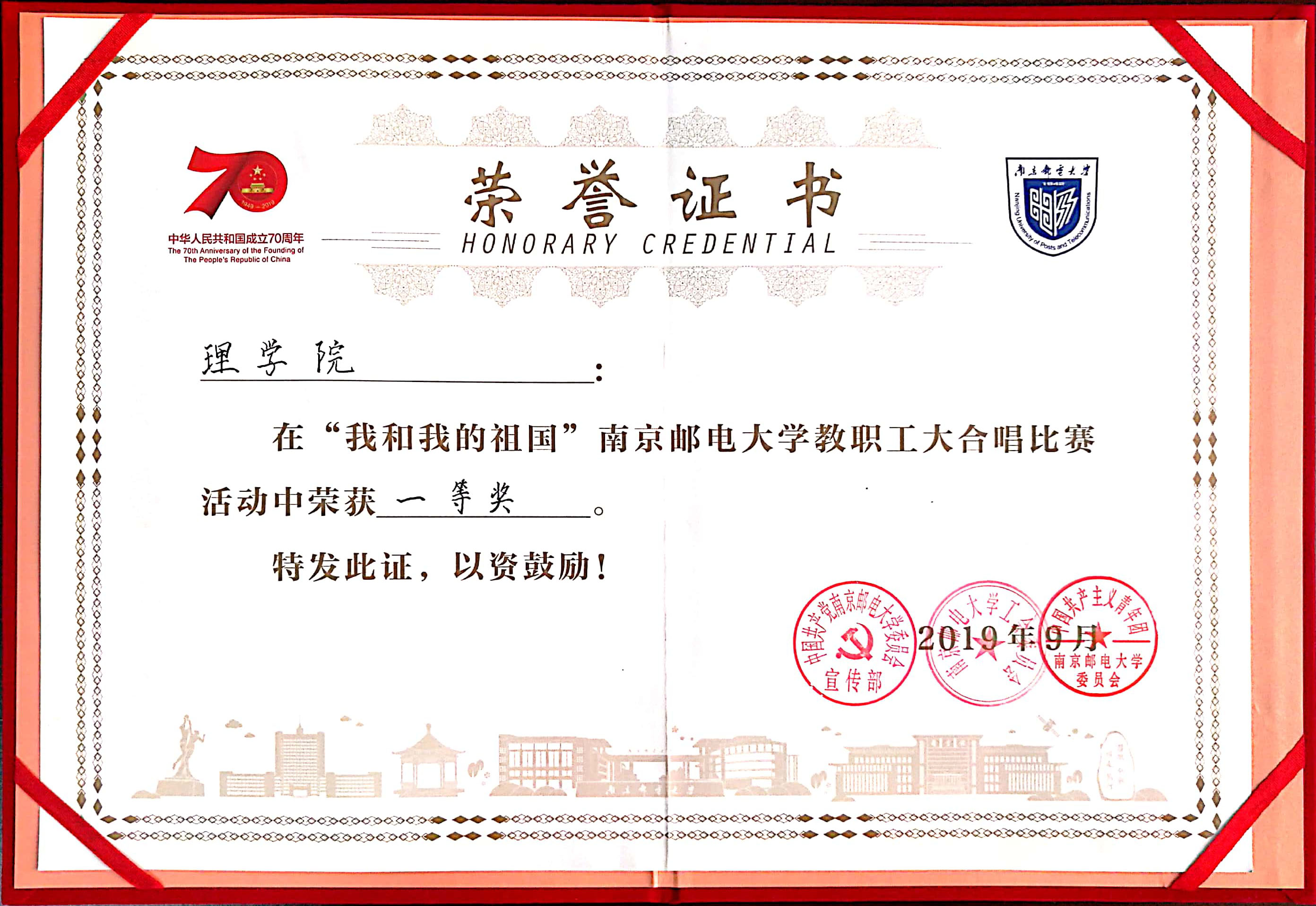 2019年09月“我和我的祖国”校教职工合唱比赛一等奖
