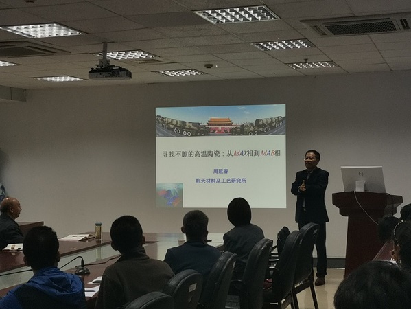周延春研究员为大家带来题为“寻找不脆陶瓷的方法:从MAX相到MAB相陶瓷”的精彩报告,主要介绍了MAX相陶瓷(Mn+1AXn,M为过渡金属、A为IIIA或IVA族原子、X为C或N)的多层次结构与宏观性能的关系,提出不脆、可加工陶瓷的判据,进而利用这些判据寻找新的超高温硼化物陶瓷。并根据MAX相的结构和性能特征,提出了预测新型三元层状硼化物的结构和性能的方法。在此基础上,设计并制备了二维过渡金属硼化物MBene。周研究员的报告结合大量生动的事例,使原本复杂晦涩的陶瓷加工过程变得简单易懂,既对新型功能陶瓷的基本概念和基本加工过程做出了清晰明确的介绍,也为当前航天领域功能陶瓷应用中的关键技术问题给出了简单明了的解释,激发了参会师生的浓厚兴趣。