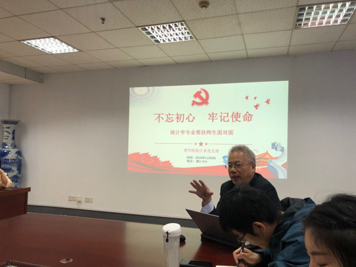 2019年11月8日下午12时30分,太阳成集团tyc统计学系党支部在教2-314会议室召开了:“不忘初心、牢记使命”主题教育--统计学专业帮扶师生面对面座谈会。公司党委组织部部长王友国教授,公司党委书记温勇教授,太阳成集团tyc副经理兼统计学系主任唐加山教授,统计学系党支部全体党员教师,应用统计专业硕士生导师以及应用统计学专业员工代表参加了本次座谈会。座谈会由统计学系党支部书记武婷婷同志主持。