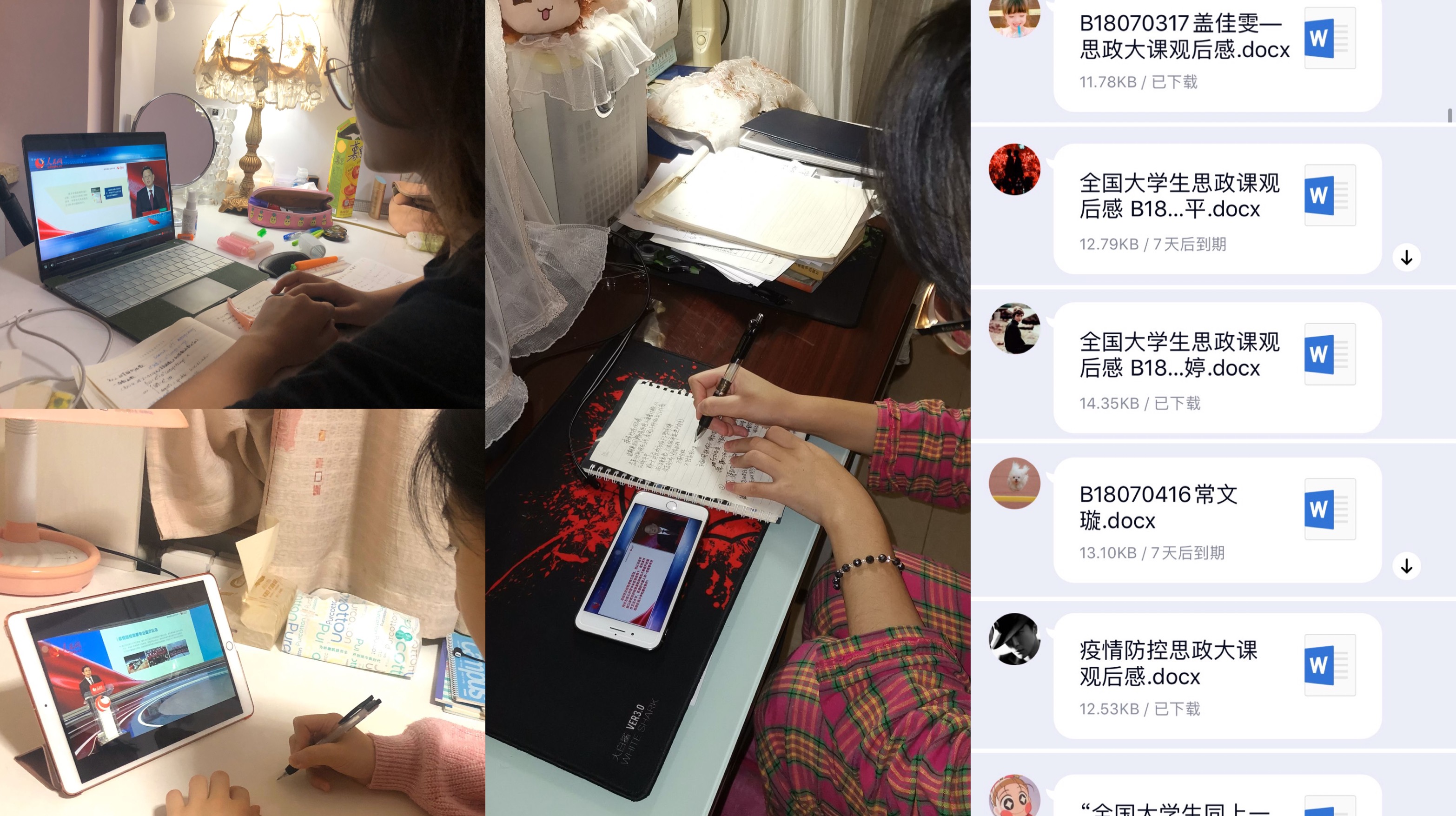 这堂课特别邀请到清华大学艾四林、中国人民大学秦宣、北京师范大学王炳林、中央财经大学冯秀军四位教授主讲,解读以习近平同志为核心的党中央关于疫情防控的决策部署,分析中国抗疫彰显的中国共产党领导和中国特色社会主义制度的显著优势,讲述了防疫战疫一线的感人故事。课时,同学们认真听讲,勤做笔记;课后积极分享自己的感悟:他们表示,疫情防控正处于关键时期,形势严峻复杂,疫情凶险,不侥幸不轻敌不恐慌,坚定必胜信心,这是战胜疫情的铁律。他们坚信,在中国共产党的正确领导下,全国人民自上而下的坚守、四面八方的驰援、万众一心的“阻击”,任何困难都会迎刃而解。