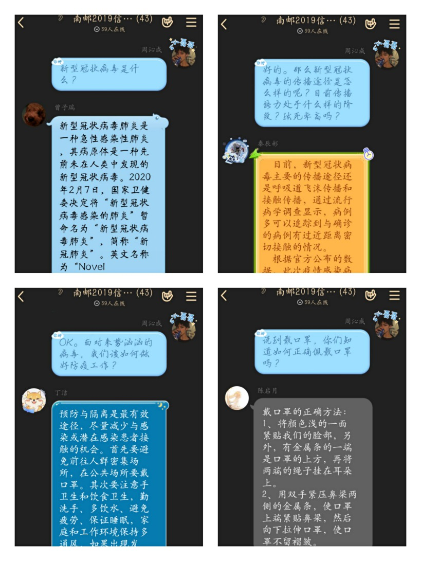 为了增加支部团员的疫情防护知识,B190702团支部组织开展了以“疫情防控 邮你邮我”为主题的防疫知识学习线上主题团日活动。支部成员在QQ群内围绕新冠肺炎的本质、新冠肺炎的症状、如何积极面对疫情以及正确有效的应对措施等问题向全体成员普及疫情防护的相关知识。通过活动的开展,大家深刻领悟了“疫情就是命令,防控就是责任”的精神内涵,也进一步了解了抗击疫情的进展情况,增强大家对坚决打赢疫情防控阻击战的信心和决心。