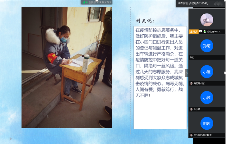 为了弘扬青春正能量,B190705团支部围绕学习战榜样,激昂青春力量开展线上主题微团课,号召大家学习逆行英雄的感事迹,肩负起时代赋予的使命与责任,做科学的传播者、健康的守护者,为抗击疫情贡献自己的一份力量,增强信念,团结一心,充分认识到当前疫情防控阶段性胜利的来之不易,服从专家科学的建议,积极为战胜疫情贡献自己力所能及力量。活动邀请了参与志愿服务工作的同学,交流心得,分享感悟。通过志愿者同学的分享,使大家更进一步理解奉献、互助的志愿者精神。