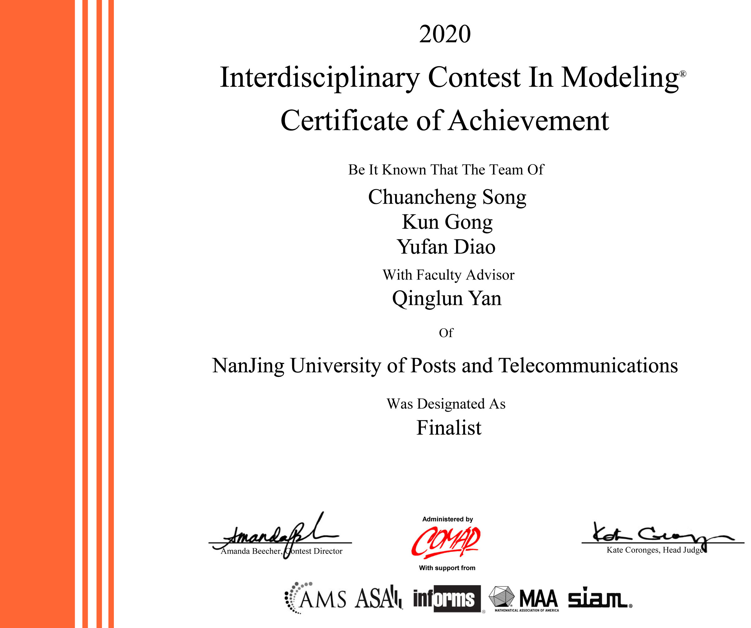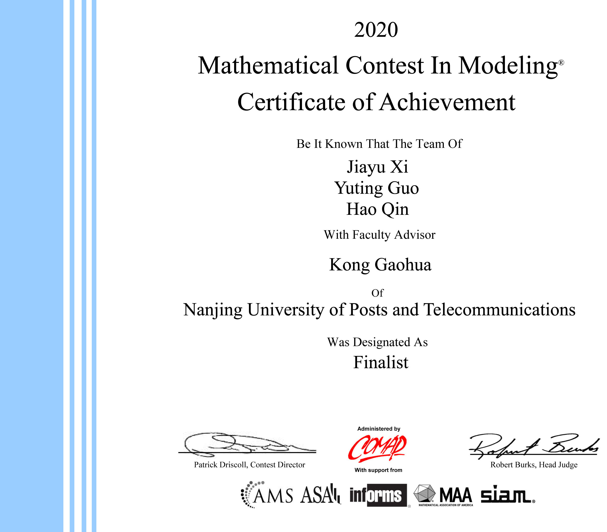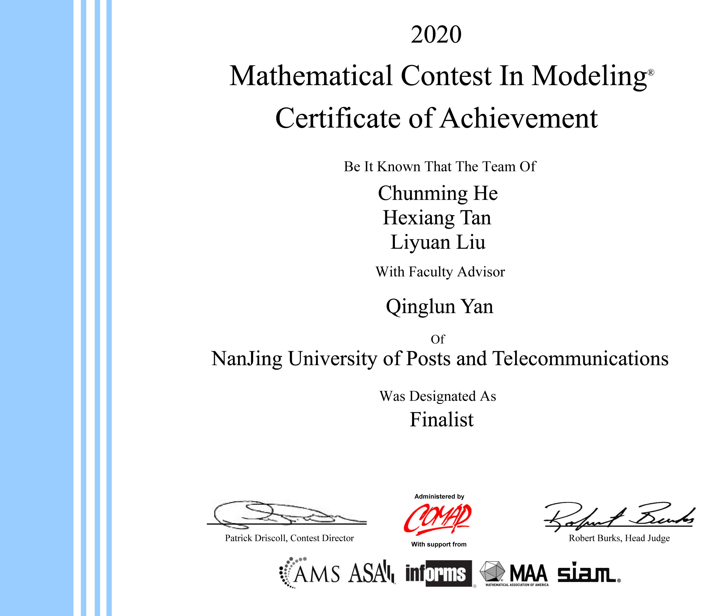 2020年美国老员工数学建模竞赛和跨学科建模竞赛结果于4月27日公布,公司继2017年获得特等奖以后再次获得特等奖,同时获特等奖提名奖5项。