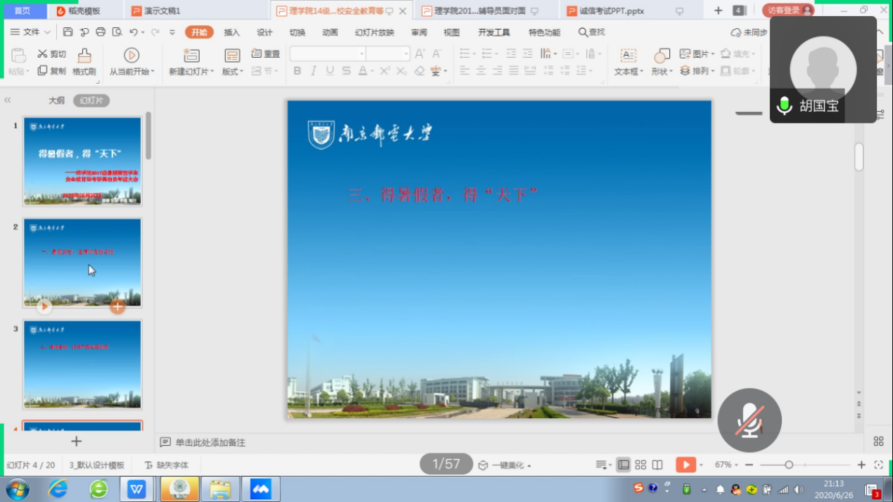 最后,胡老师给大家强调了疫情期间的身体健康问题,强调了暑期安全及留校的通知要求、强调诚信考试问题。同时,胡老师关心地提醒大家注意考研准备节奏,提出考研“得暑假者,得天下”,并预祝2017级考研取得好成绩。