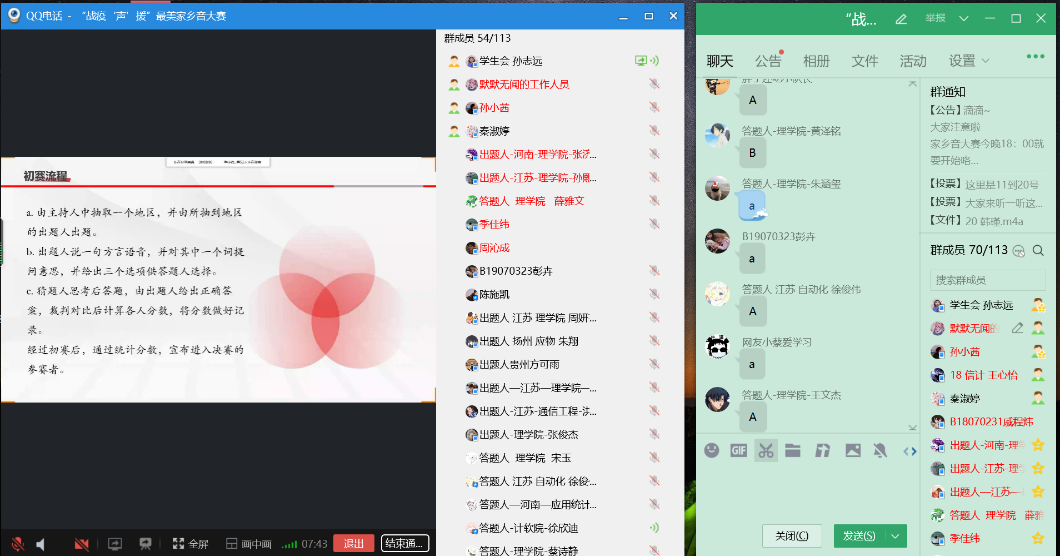 活动依托QQ平台,采用线上群语音的方式开展。比赛第一阶段,由所有出题人依次出题,参赛者进行答题,在题目全部答完以后,将答案选项以QQ群作业的形式上传,由裁判员进行比较计分,最终优胜同学进入第二阶段。在第二阶段,由出题人依次出题,所有答题人在群中进行抢答,优先给出正确答案的参赛者积一分,分数最高的答题人胜出。经过角逐与投票,张济薪、周妍芸、马小雲、冯静怡、谷荣、谢艳获得“最佳”出题人;蔡诗静、张云舒、徐俊伟、胡悦凯、陈玉、王文杰获得“最佳”答题人。