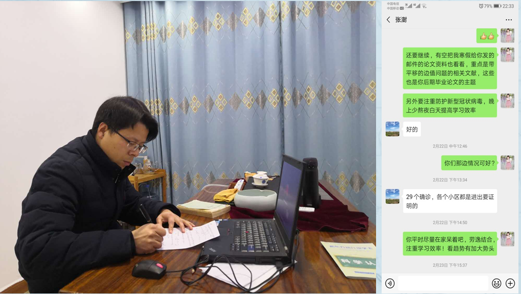 郭国安老师今年春节难得回老家和家人团聚,却被困新冠肺炎疫情重灾区的湖北黄冈。滞留老家近三个月时间里,郭老师坚持对本科生和研究生开展“云指导”,并注重营造疫情防控期间的人文课堂,倡导“隔屏隔心”,将“面对面热情沟通”转型为“键对键暖心交流”。