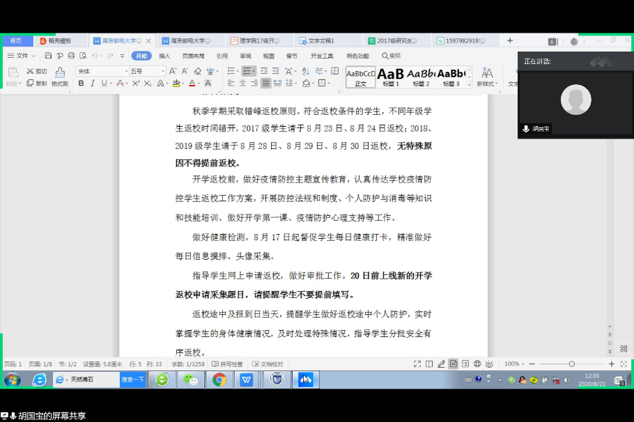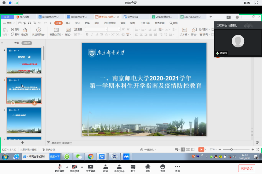 2020年8月21日中午,太阳成集团tyc2017级通过腾讯视频线上会议的形式召开了年级大会暨“开学第一课”,会议由2017级辅导员胡国宝老师主持。