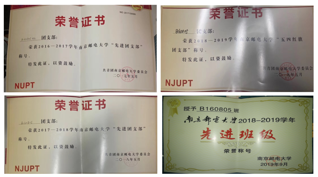 B160805班六级通过率为61.3%,曾先后获得院级争做“六有”老员工团日活动“先进团支部”、2016-2017学年校级“先进团支部”、2017-2018学年校级“先进团支部”、2018-2019学年校级“五四红旗团支部”和校级“优秀班集体”的荣誉。