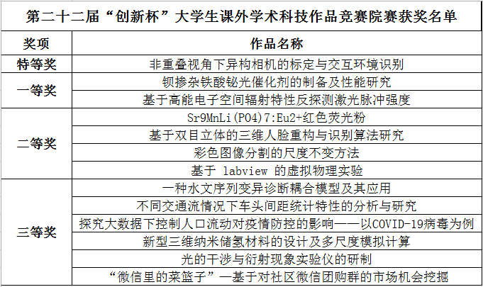 通过答辩评审,“非重叠视角下异构相机的标定与交互环境识别”项目获得院赛特等奖,“钡掺杂铁酸铋光催化剂的制备及性能研究”等2个项目获得院赛一等奖,“Sr9MnLi(PO4)7:Eu2+红色荧光粉”等4个项目获得院赛二等奖,“一种水文序列变异诊断耦合模型及其应用”等6个项目获得院赛三等奖。