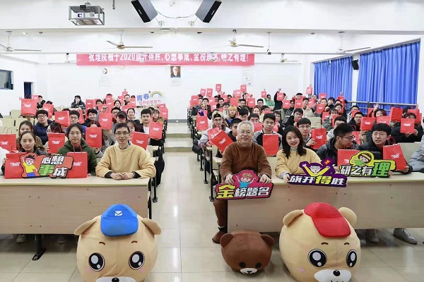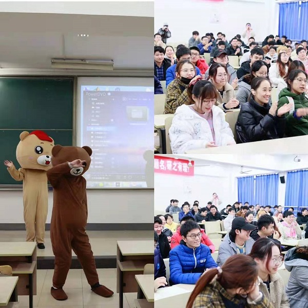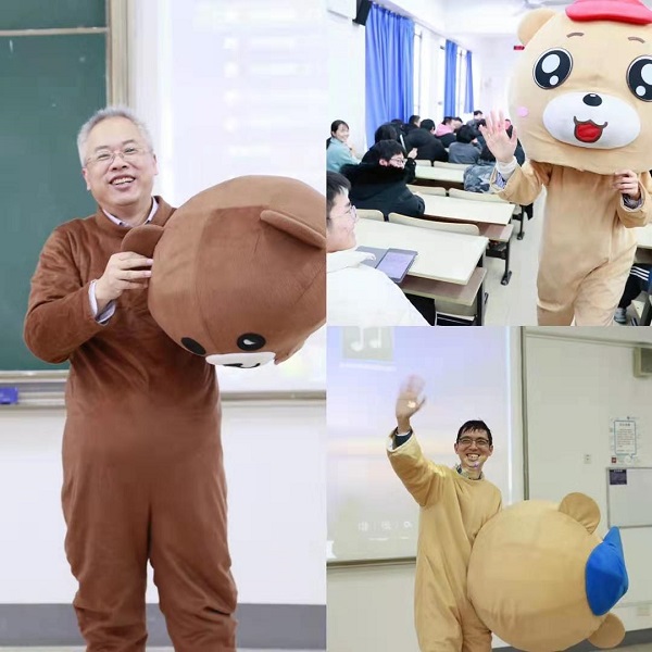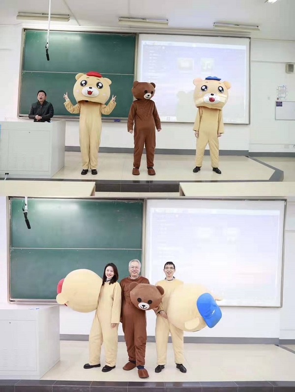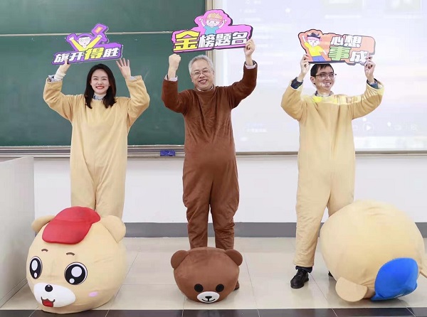 太阳成集团tyc的三位院领导打扮成三个小熊玩偶,迈着可爱的步伐走进了考研教室,憨态可掬的形象瞬间吸引了同学们的注意力。“小熊”跟同学们握手、拥抱,给大家加油鼓劲儿。揭开头套时,全场欢呼了起来,平日严肃的老师们不顾形象只为搏同学们一乐,大家又惊喜又感动。