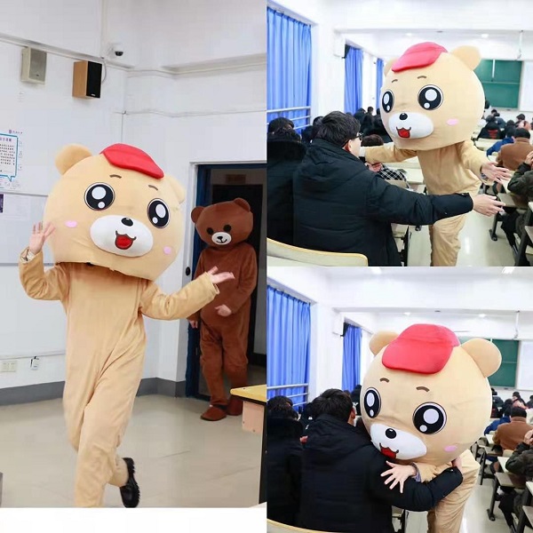 坐在第一排的姜金宇同学积极地与“小熊”们互动,他说:“昨天背了一天的政治,在 ‘肖四肖八’思想的疯狂轰炸下,脑子都成了浆糊。今天和‘小熊 ’拥抱、看‘小熊’做搞怪好笑的动作,开怀大笑后心情也放松了许多。”