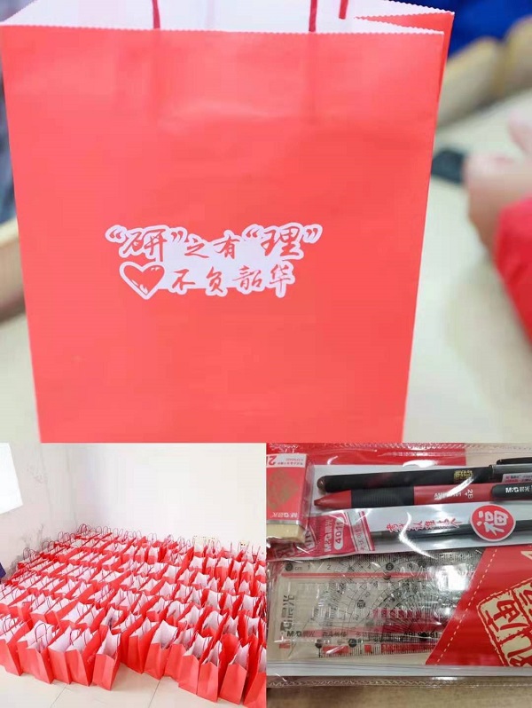 公司党委副书记、副经理汪颖为员工发放加油慰问礼包。她说:“礼包中有一套喜气洋洋的红色文具,有象征着“苹苹”安安、心想事“橙”的苹果和橙子,有为考试补充能量的四块德芙巧克力,祝福考研学子们旗开得胜、金榜题名。”
