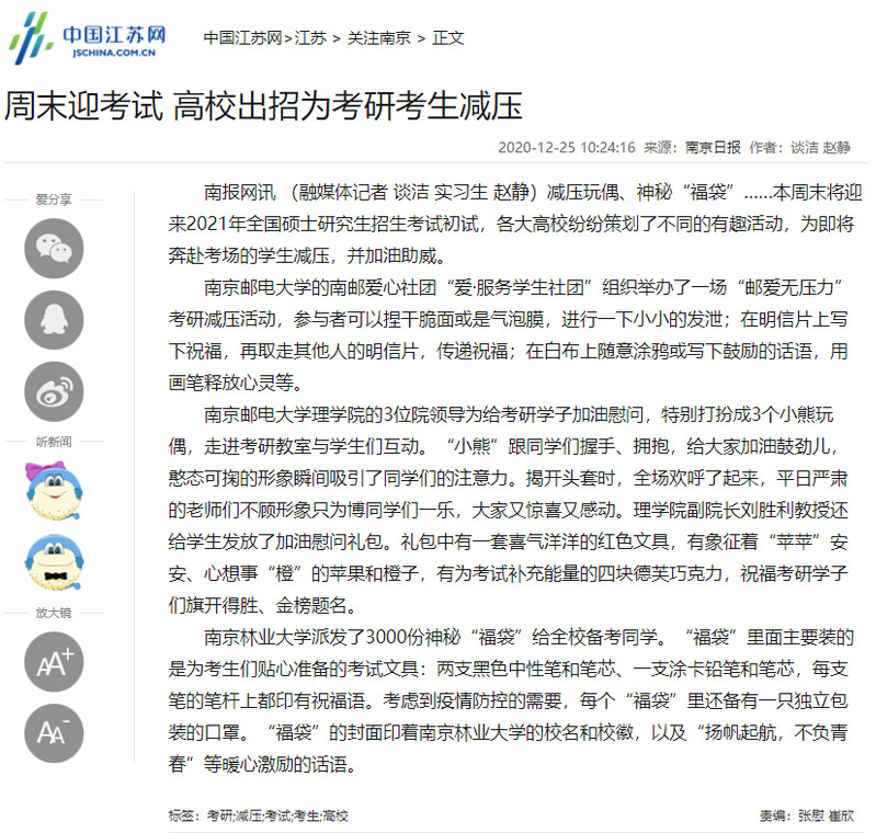 【中国江苏网】周末迎考试 高校出招为考研考生减压