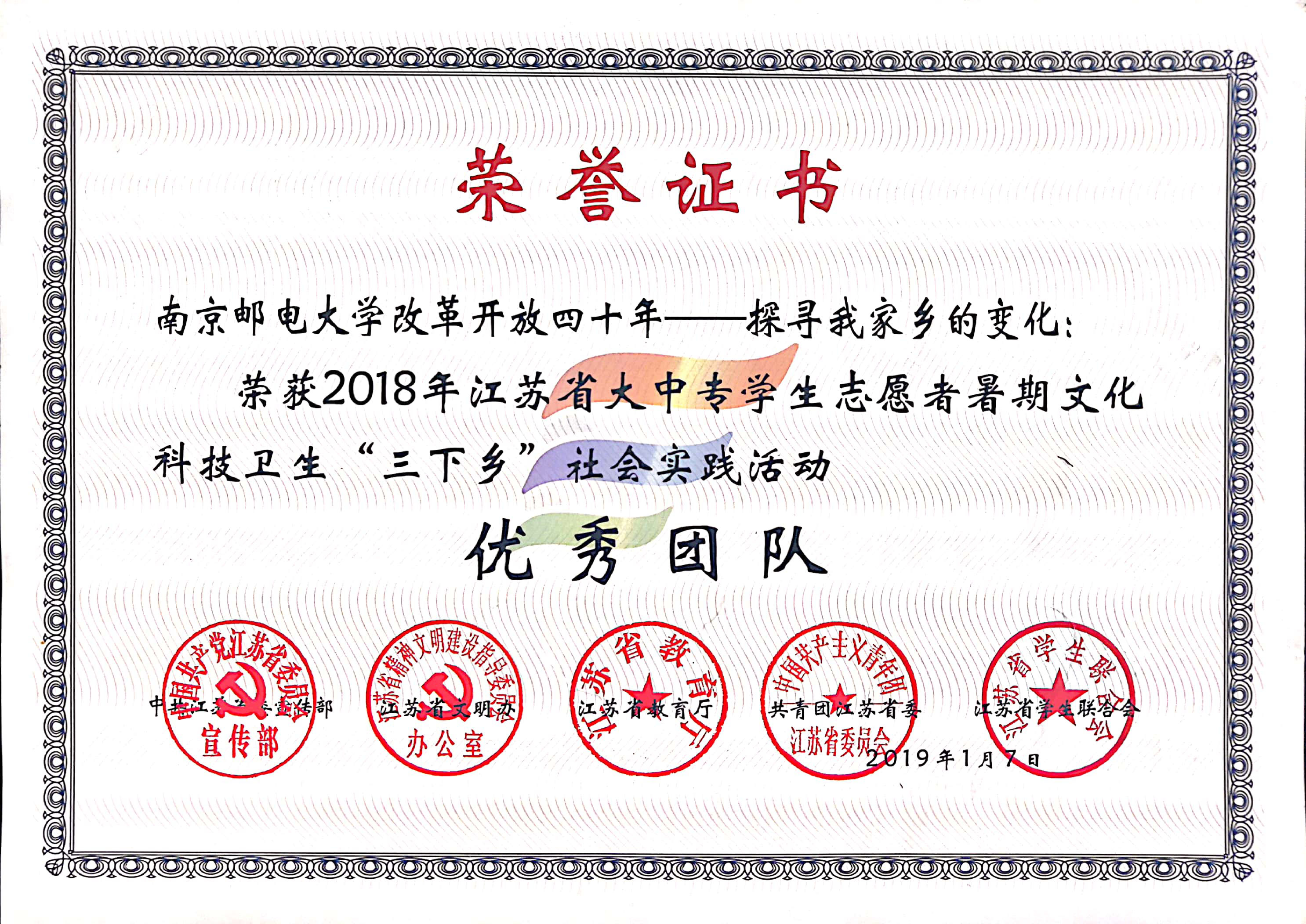 2019年1月江苏省大中专员工志愿者暑期文化科技卫生“三下乡”社会实践活动优秀团队