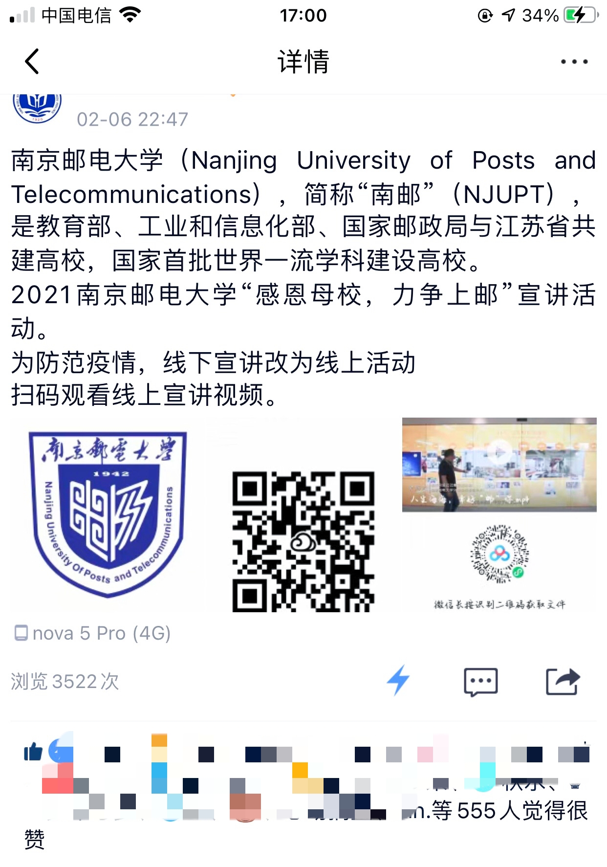 团队成员严格遵守疫情防控规定,在充分了解母校疫情防控相关规定后,于一月下旬向母校德育处毛记平主任报备,服从母校的安排,自主录制宣讲视频,由德育处把关,在视频获得母校认可后,由高三年级组统一播放给备战高考的莘莘学子观看。此外团队充分利用qq空间进行宣传,浏览次数超过3000次,获点赞数量超过500。