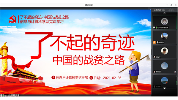 2月26日下午信息与计算科学系党支部全体党员教师在腾讯会议上集中学习了习近平总书记在全国脱贫攻坚总结表彰大会上的重要讲话。本次活动由支部书记戴建新召集,由该支部严珍珍老师轮值主持分享学习心得和体会。副经理金正猛教授以普通党员身份参加了党课学习。