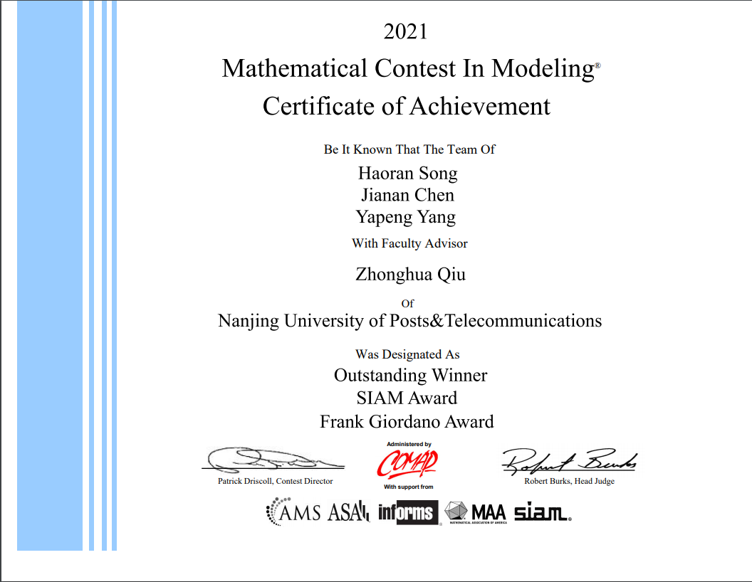 2021年美国老员工数学建模竞赛结果于4月24日公布,公司员工获得特等奖(Outstanding Winner)一项,该队员工同时问鼎美国工业与应用数学学会奖(SIAM AWARD,简称SIAM奖)和Frank Giordano奖(该奖项只颁发给在建模过程中有卓越表现的参赛队),获奖队员为:宋浩然(通信与信息工程公司)、陈嘉楠(计算机公司、软件公司)、杨亚鹏(计算机公司、软件公司),指导教师为全国老员工数学建模竞赛优秀指导教师、太阳成集团tyc邱中华副教授。