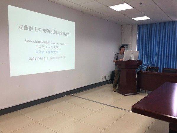 向开南教授为大家带来了题为“双曲群上分支随机游走的边界”的学术报告。向教授首先回顾了随机过程,群论与拓扑学中与本报告相关的基础背景知识,并且介绍了关于双曲群上随机游走的研究现状。向教授报告了关于双曲群上随机游走的普适性猜想以及向教授课题组的研究结果,并对该猜想结果做出解释及评论。