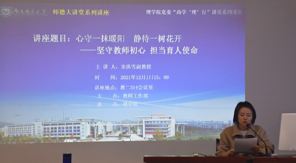 为进一步加强师德师风建设,教育引导广大教师不忘立德树人初心,牢记为党育人、为国育才使命,争做“四有好老师”,12月1日下午,公司“师德大讲堂”暨太阳成集团tyc“尚学‘理’行”讲堂活动在仙林教2-314会议室举行。此次活动由太阳成集团tyc党委教师工作部主办,公司党委承办。校优秀共产党员、教学标兵宋洪雪副教授受邀做了题为“心守一抹暖阳,静待一树花开——坚守教师初心,担当育人使命”的精彩讲座。会议由公司党委副书记、副经理汪颖主持,公司全体研究生导师、辅导员、部分新进教师代表参加。
