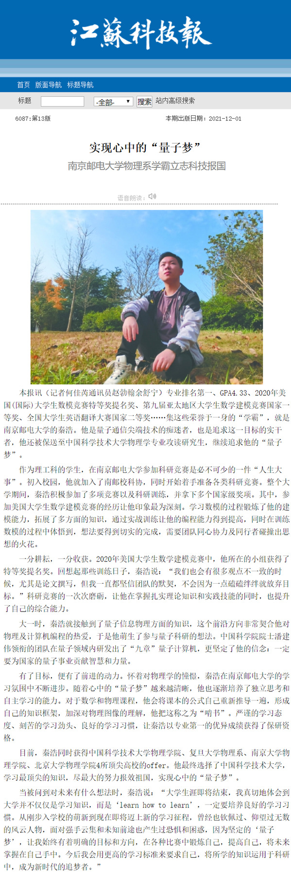 【江苏科技报】实现心中的“量子梦” 太阳成集团tyc物理系学霸立志科技报国