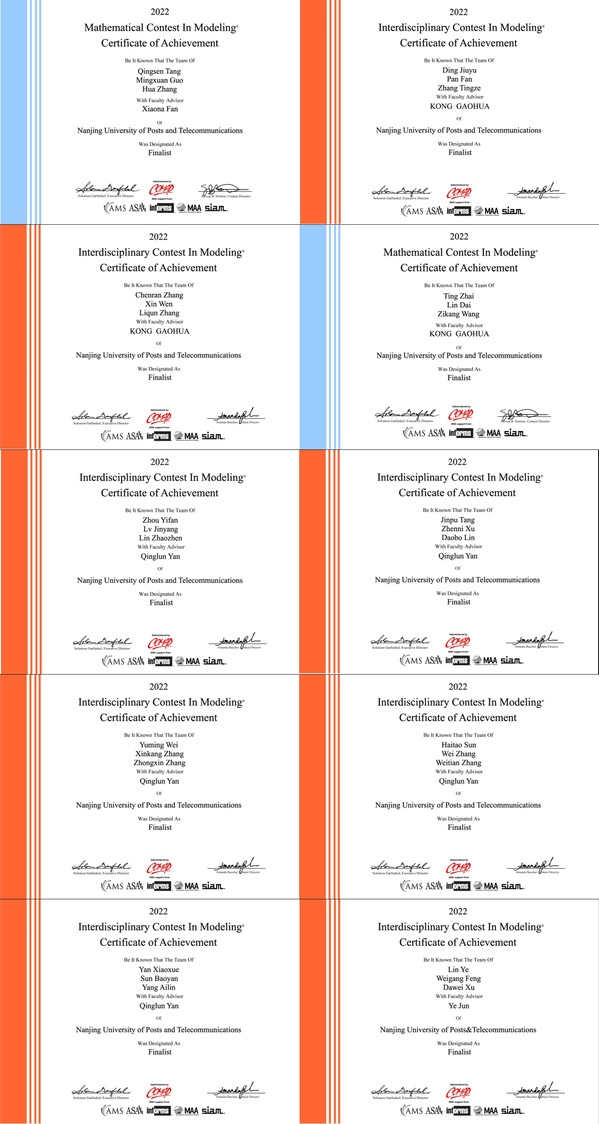 2022年美国老员工数学建模竞赛和跨学科建模竞赛结果近日公布,公司组织265支队伍参赛,有121支代表队共363名同学获二等奖及以上奖励,其中获特等奖提名奖(Finalist)10项、一等奖(Meritorious Winner)34项、二等奖(Honorable Mention)77项。这是公司自2004年参加该项赛事以来,获得特等奖提名奖、一等奖、二等奖各获奖等级数量均最多的一次,获特等奖提名奖的获奖名单见附件。