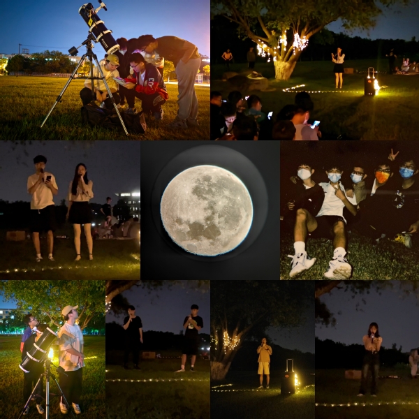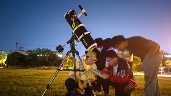 星临万户动,月傍九霄多。又是一年观星季,夜晚观星已进入舒适的时节。随着银光布满草坪,同学们躺在草坪上目触满天星光,体会那亘古不变的珍贵。2021级应用物理专业的柯占林同学准备了专业的天文设备,并为大家介绍了观星的注意事项、当天所能看到的星星名称、星星的具体位置等,同学们听得饶有兴致,在天文望远镜前排起了长队,纷纷想要透过倍镜窥探这神秘莫测的夜空。