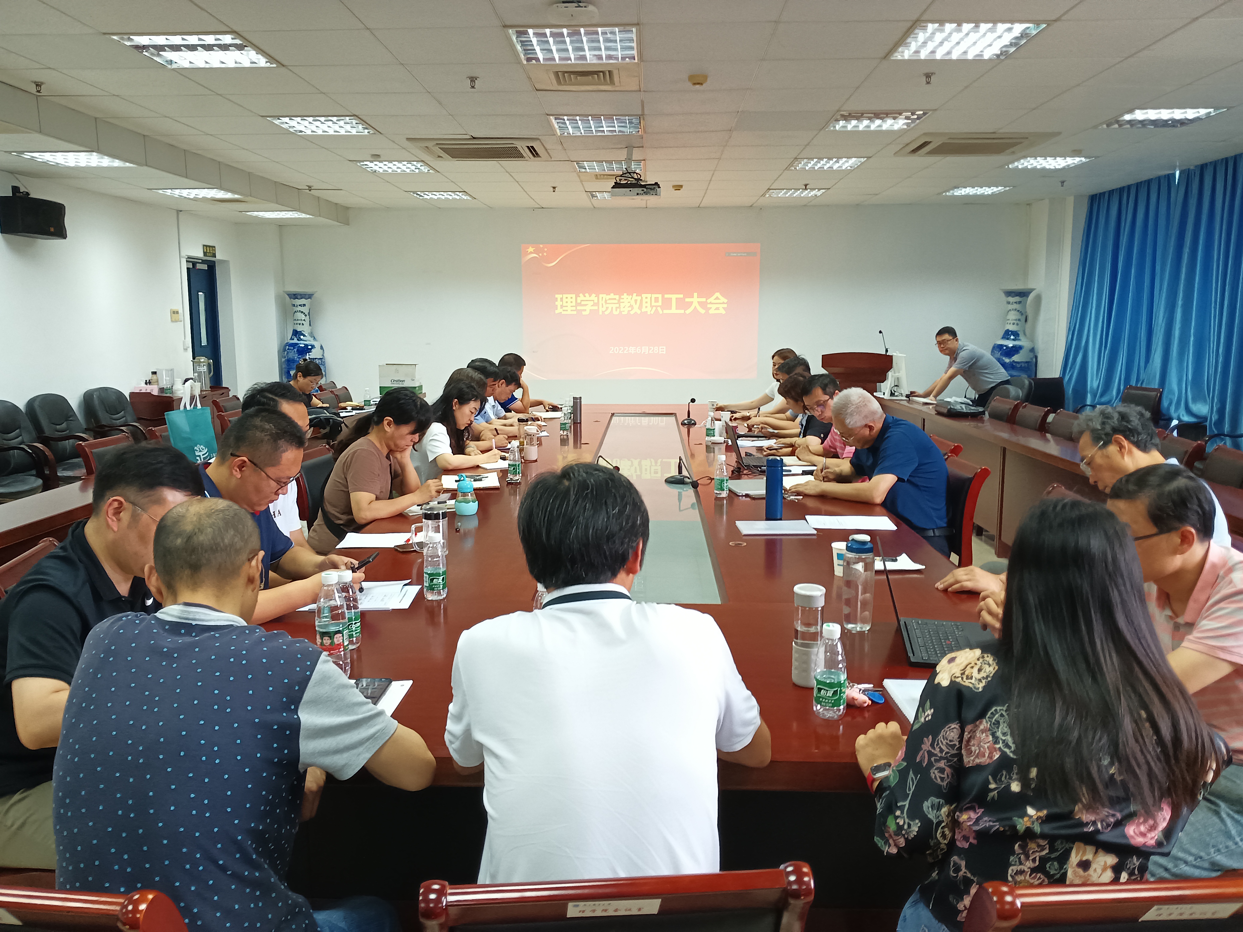 2022年6月28日,太阳成集团tyc在教2-314会议室召开全体教职工大会,总结回顾2022年上半年各项工作,传达公司最新疫情防控工作精神,安排部署公司下半年各项工作。会议以线上线下相结合的方式进行,全体院领导、系(中心)主任、党支部书记出席现场会议,其他教职工参加线上会议。会议由党委书记尹志丽主持。