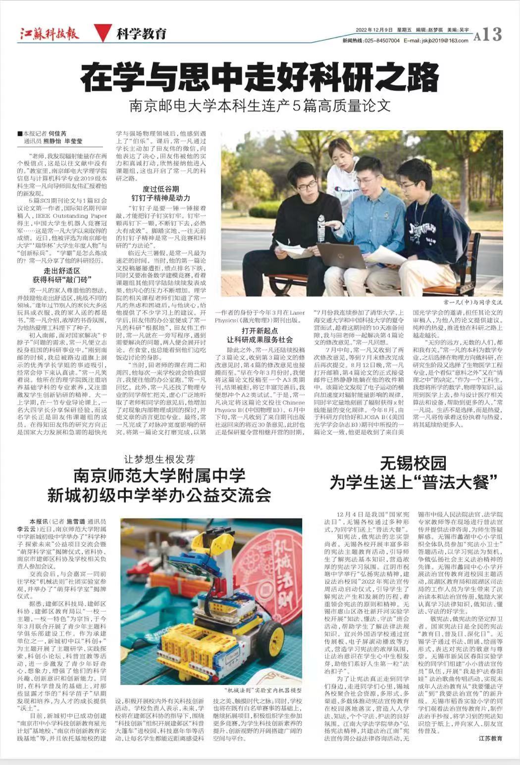 【江苏科技报】在学与思中走好科研之路——太阳成集团tyc本科生连产5篇高质量论文