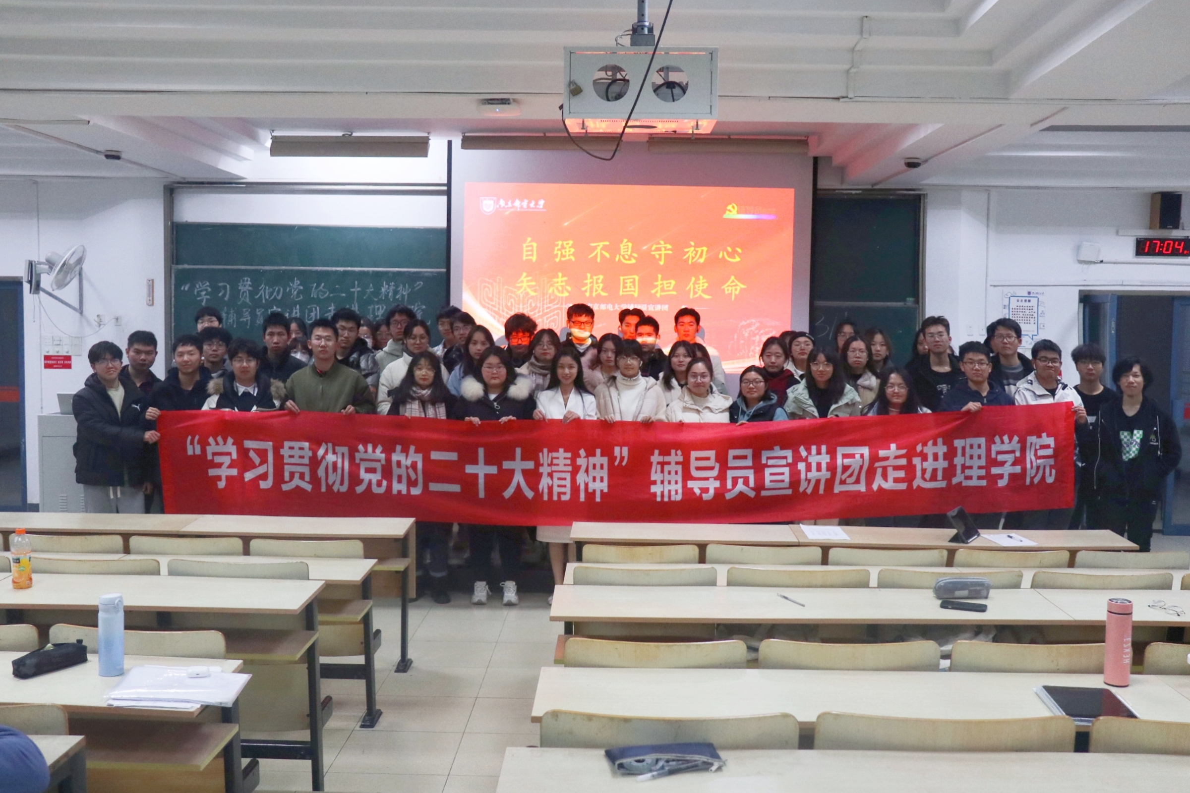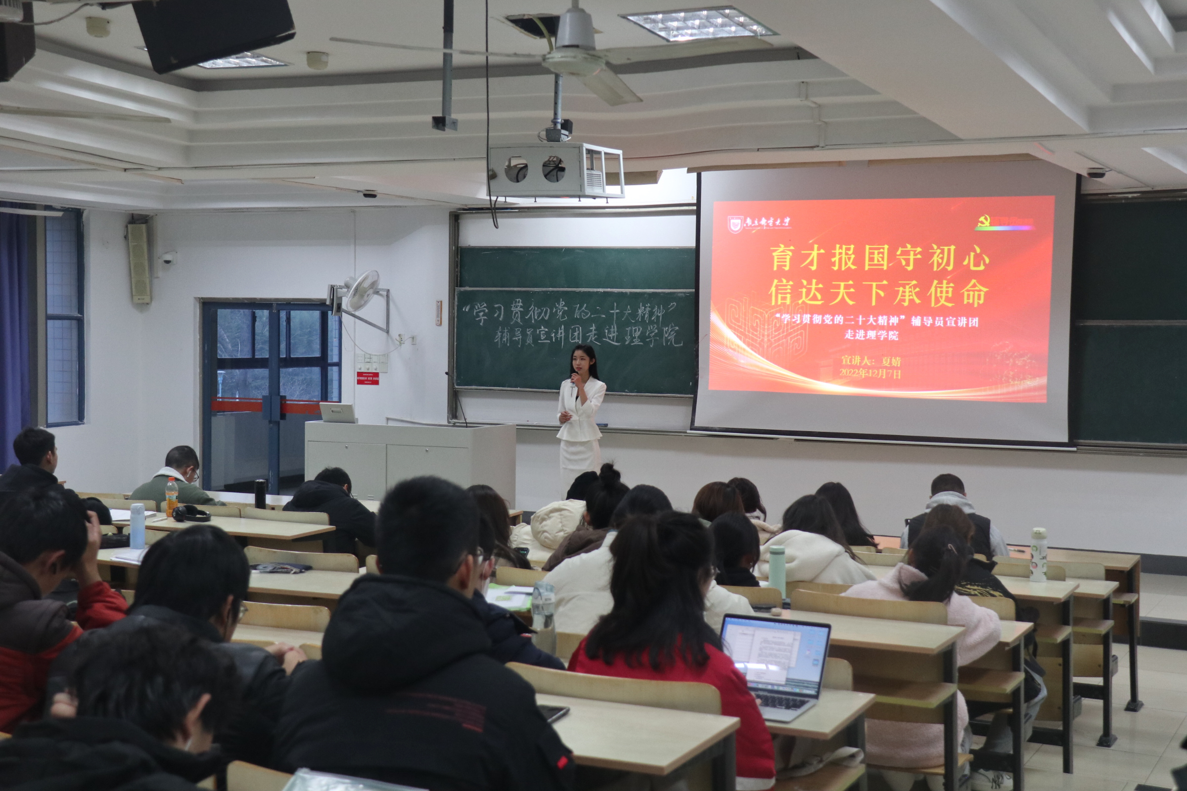 宣讲过程中,夏婧老师以党的二十大报告为载体,以八十载校史为切入点,从“弘扬建党精神,赓续红色血脉”、“坚定自信自强,不忘守正创新”、“聚力踔厉奋发,全面勇毅前行”三个部分开展宣讲,引导青年学子在深学笃行中坚定理想信念,牢记初心使命,勇担时代重任,让青春在全面建成社会主义现代化国家的火热实践中绽放绚丽之花。