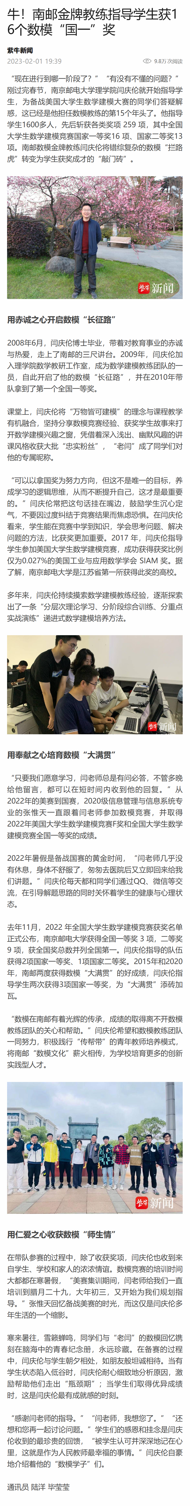 【扬子晚报客户端】牛!南邮金牌教练指导员工获16个数模“国一”奖