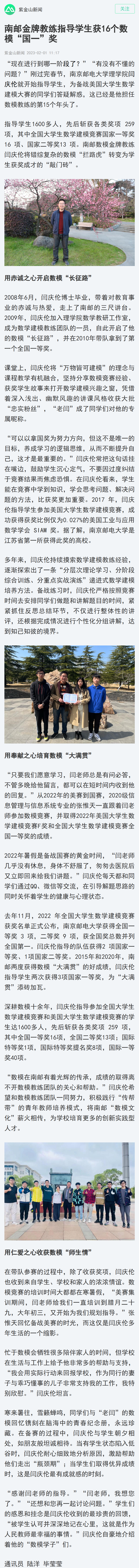 【南京日报客户端】南邮金牌教练指导员工获16个数模“国一”奖