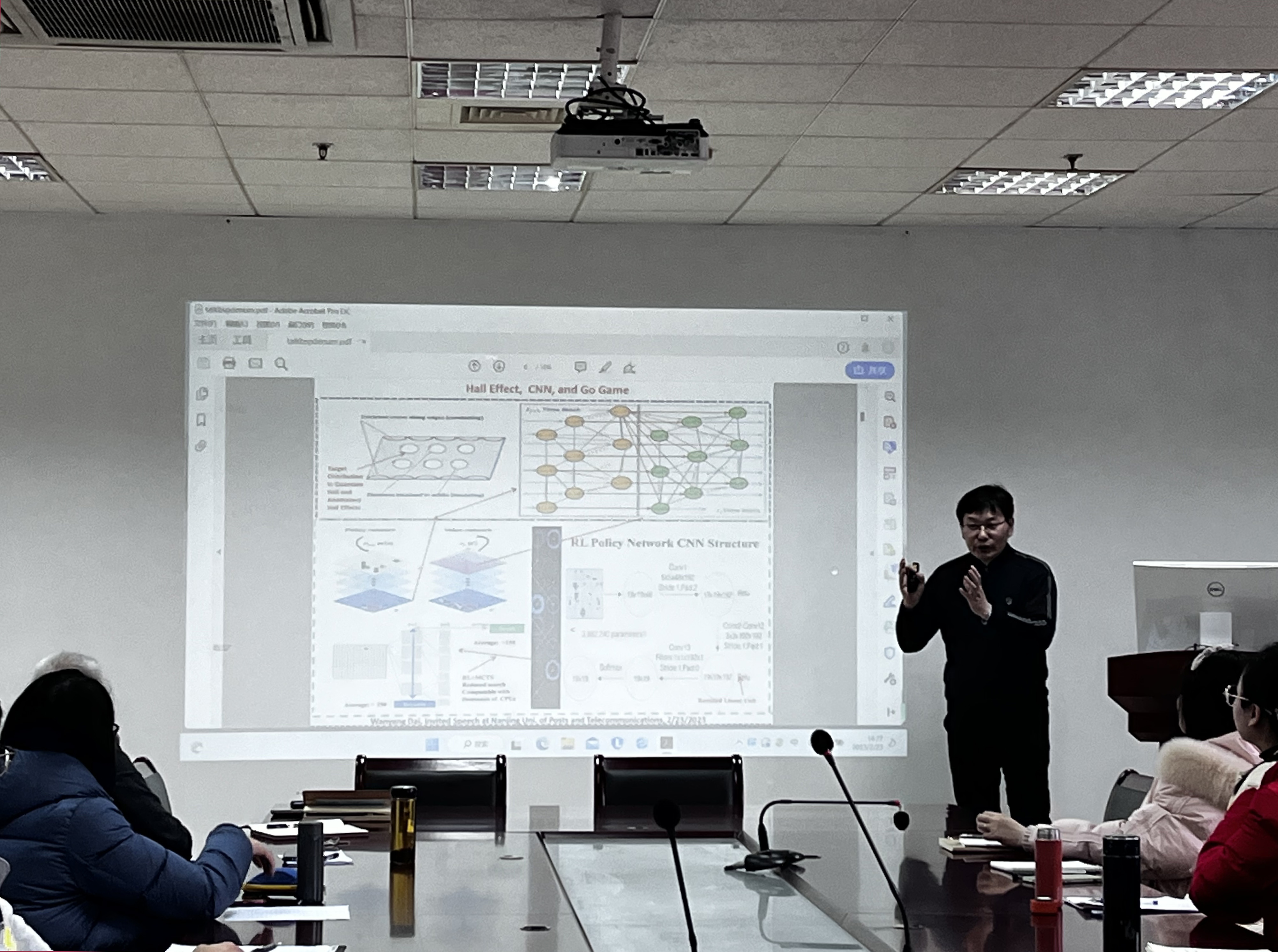 戴万阳教授为大家做了题为“倒向随机偏微分方程:基于神经网络与机器学习的求解与应用”的学术报告。戴教授为报告会做了精心的准备,他首先回顾了概率、方程、泛函中与本报告相关的基础背景知识,介绍了基于卷积神经网络与机器学习的智能共性算法来求解归一化的倒向随机偏微分方程适应解的具体思路,并利用该求解过程来诠释当前人工智能领域的一些热点问题。此外,介绍了为证明归一化方程适应解的存在性与唯一性及智能算法收敛性引入的Malliavin随机泛函偏导数,并通过例子和拟合结果展示方法与理论的有效性。最后,戴教授分享了他们团队近期的研究成果,并提出一些具有一定难度和尚未解决的问题,以此开阔师生的思路。